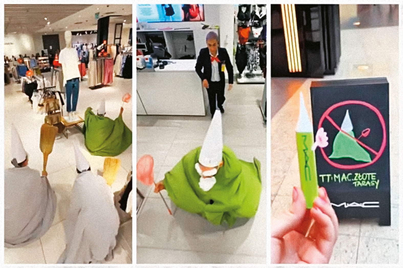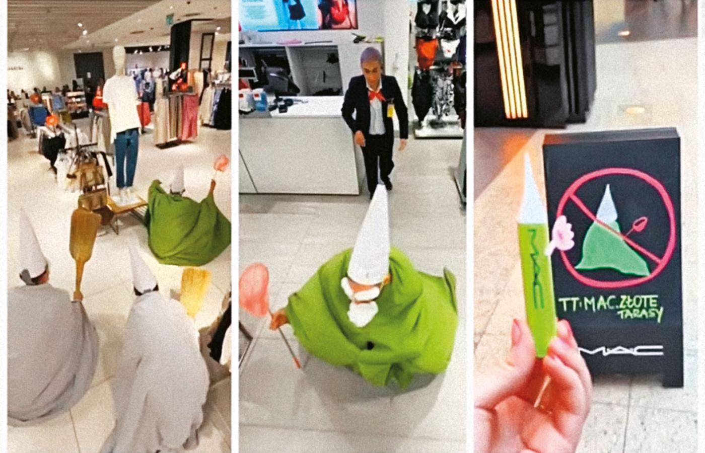 Nie od dziś memy wychodzą na ulice. Internetowe łobuzy i dowcipnisie do prowadzenia swojej działalności potrzebują przecież realnej przestrzeni. Przed laty wygłupami (typu: przebieranie psa za pająka giganta i nagrywanie reakcji przerażonych ludzi) sławę zdobył Sylwester Wardęga. Dopiero po latach jego zabawy zaczęły być kwestionowane – jak akcja z 2014 r., w której pod pozorem „promowania badań” Wardęga łapał kobiety za piersi. Ostatnio zaś po Warszawie zaczął grasować w przebraniu gnoma-czarodzieja tiktoker @crawly_possessed. Na pierwszy rzut oka wygląda słodko i niegroźnie: ot, młody człowiek, który zakłada szpiczastą czapkę, sztuczną białą brodę, chodzi w kucki owinięty zielonym kocem, z magiczną różdżką w ręku. Tyle że tiktokowy gnom za kierunek swoich eskapad wybrał nie tylko lasy czy ulice, ale też warszawskie sklepy i punkty gastronomiczne – drepcze między półkami, wchodzi za ladę, nie tylko irytując pracowników, ale i stwarzając niebezpieczne sytuacje.