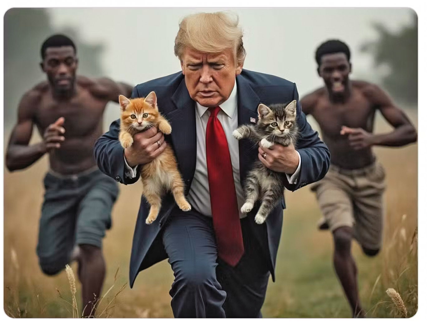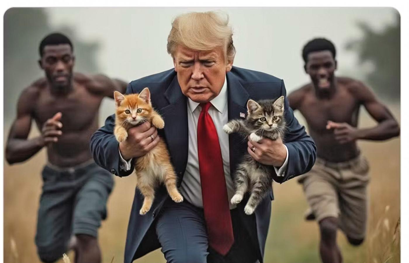 Kilka godzin przed tym, jak kandydaci na prezydenta USA zaczęli się pojedynkować podczas telewizyjnej debaty w ABC News, sztuczna inteligencja została zaprzęgnięta do produkowania memów przedstawiających Donalda Trumpa z kotami i kaczkami. Na jednym z nich miliarder, trzymając pod pachami dwa kiciusie, ucieka przed czarnoskórymi mężczyznami. Na innym ze srogą miną i karabinem w ręku, otoczony zgrają dachowców, dosiada kota wielkości kucyka. Na jeszcze innym radosny jak dziecko pluska się z grupą kaczek. Jest też taki przedstawiający parę kotów obejmujących się z trwogą i podpis: „Proszę, zagłosujcie na Trumpa, aby haitańscy imigranci nas nie zjedli”. Te i podobne obrazki były publikowane przez wpływowych polityków Partii Republikańskiej, zwolenników Trumpa oraz jego syna Donalda Trumpa jr.