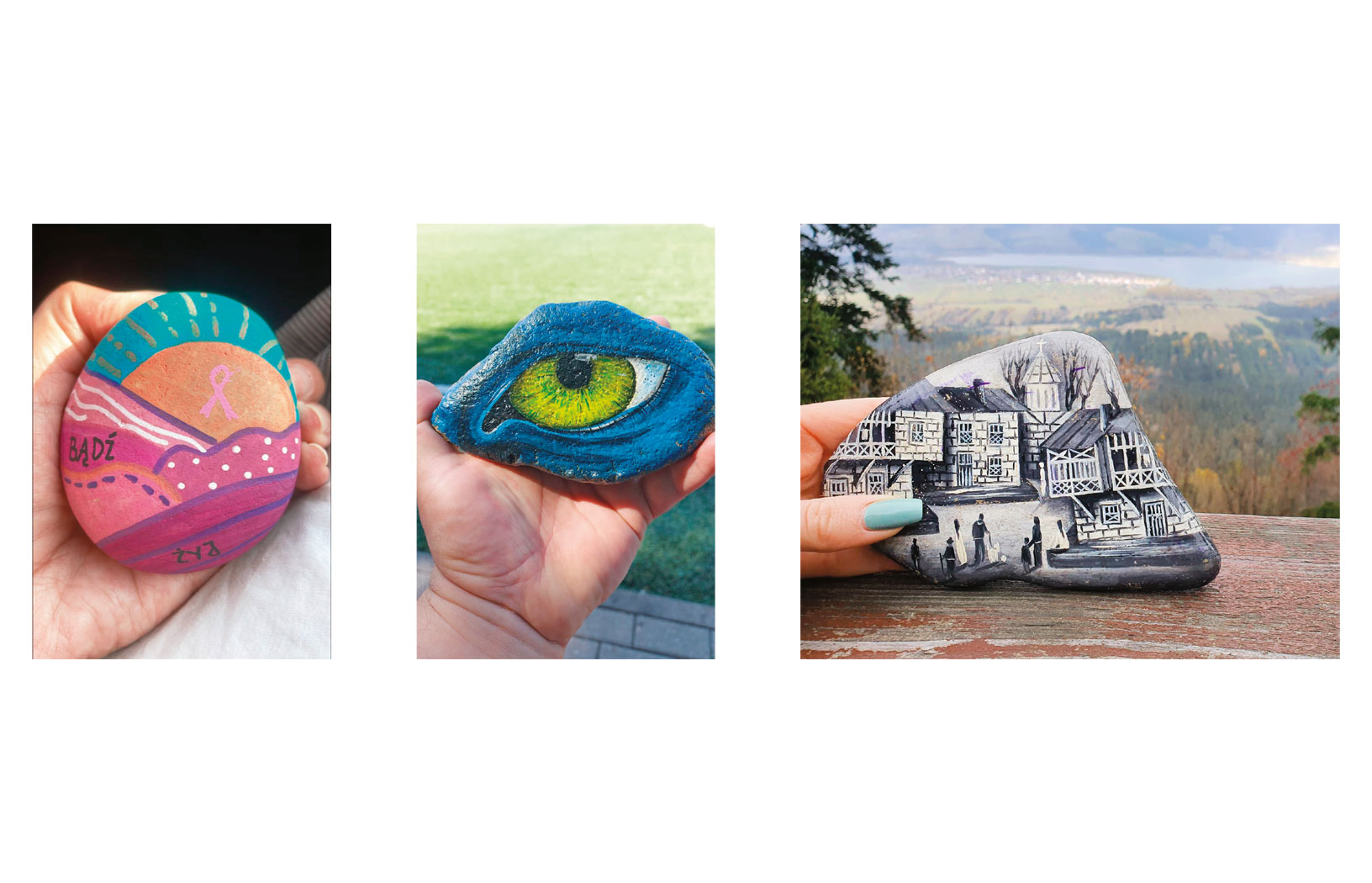 Cała frajda polega nie tylko na odszukaniu jakiegoś okazu, ale na ustaleniu, że ktoś znalazł i podał dalej kamyk przygotowany przez nas, a także na obserwowaniu, jaką pokonuje on drogę. Po to na każdym kamieniu zapisuje się kod pocztowy naszej miejscowości, który potem możemy wyszukać na Facebooku (o ile oczywiście ktoś podzieli się znaleziskiem). Samo malowanie kamyczków przed ich podróżą stanowi już część zabawy. A udekorowane są przeróżnie: od prostych wzorków, przez zabawne rysunki zwierzaków, grzybków, postaci z kreskówek, aż po prawdziwe „dzieła sztuki” stworzone z dużą dbałością o detale.