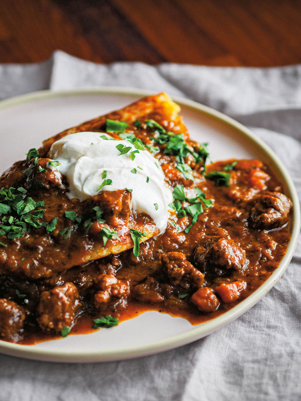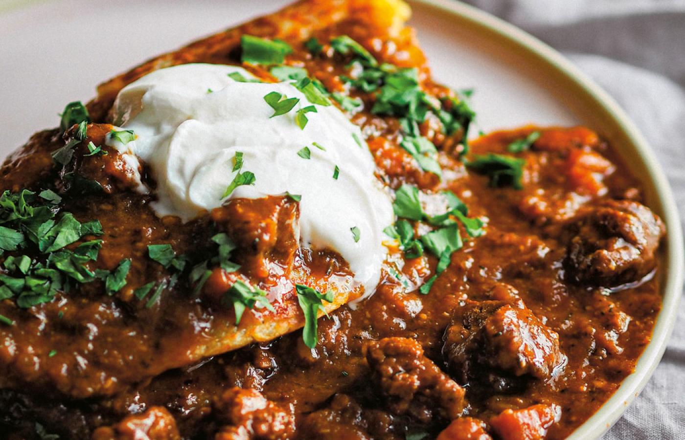 Długo pracowałem nad tym przepisem. Zastanawiałem się, jak to wszystko poskładać, by gulasz był odpowiednio mięsisty i przypominał klasyczny smak, który wszyscy znamy i kojarzymy z tym daniem. Na podstawę wybrałem warzywa, cebulę, czosnek i marchewkę, by zapewnić mu nieco delikatnej słodyczy. Suszone grzyby, koncentrat pomidorowy i sos sojowy dają piąty smak, czyli umami, a kostka sojowa dobrze sprawdza się jako źródło białka. Jeżeli nie chcemy użyć soi, można ją zastąpić innymi strączkami, np. fasolą lub soczewicą. Zestaw przypraw, jaki udało mi się dobrać, jest dosyć bogaty, ale warto zdobyć je wszystkie, by poczuć pełnię smaku. Dalej jest już tradycyjnie: wszystko podsmażamy, deglasujemy (czyli podlewamy – w tym przypadku bulionem) i dosyć długo gotujemy, by wszystkie smaki mogły się ze sobą zapoznać, przegryźć, następnie całość redukujemy.