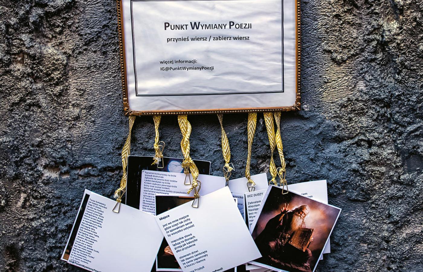 „Niektórzy – / czyli nie wszyscy. / Nawet nie większość wszystkich, ale mniejszość. / Nie licząc szkół, gdzie się musi, / i samych poetów, / będzie tych osób chyba dwie na tysiąc” – pisała Wisława Szymborska („Niektórzy lubią poezję”). To właśnie ona, jak wyjaśnia Kuba Kozłowski, pomysłodawca Punktu Wymiany Poezji, jest nieoficjalną patronką tego nieformalnego klubu osób rozkochanych w liryce. Osób, które są nie tylko odbiorcami poezji, ale też – a może przede wszystkim – twórcami. – Chcemy, żeby wiersze nie lądowały na dnie szuflad przez nikogo nieprzeczytane i by młodzi ludzie dostrzegli, że poezja nie musi być napuszona, że to nie tylko Mickiewicz czy Słowacki. Poezja ma potencjał, aby zainteresowało się nią więcej niż tylko dwie na tysiąc osób – opowiada Kozłowski i cytuje przywołany już fragment wiersza polskiej noblistki.