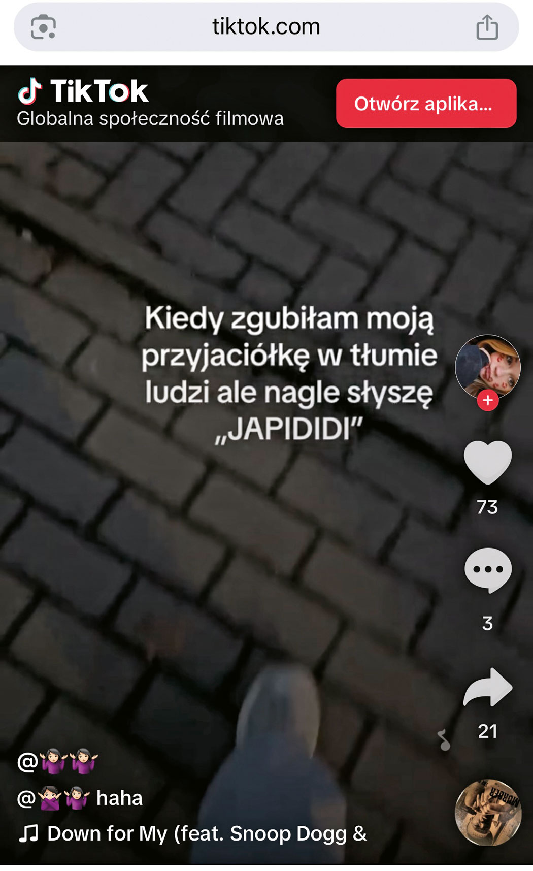 Kto tego używa? Już wiemy, że kibice Igi Świątek. Na pewno też młodzi słuchacze Playboia Cartiego, skoro nagłe pojawienie się jego nowej płyty komentują: „Japidi, Carti dropnął na Spoti” („dropnąć” oznacza „mieć niezapowiedzianą premierę”, „Spoti” to Spotify). Też miłośnicy Quebonafide, bo gromadne „o, japidi” rozległo się, gdy raper ogłosił „ostatni koncert” na Stadionie Narodowym, a w związku z dużym zainteresowaniem dodał zaraz drugi „ostatni koncert”. Przede wszystkim jednak widać to słowo w obu wersjach na TikToku, gdzie pewna narciarka opublikowała film z komentarzem: „Kiedy zgubię moją siostrę na stoku, ale nagle słyszę »japidi«”.