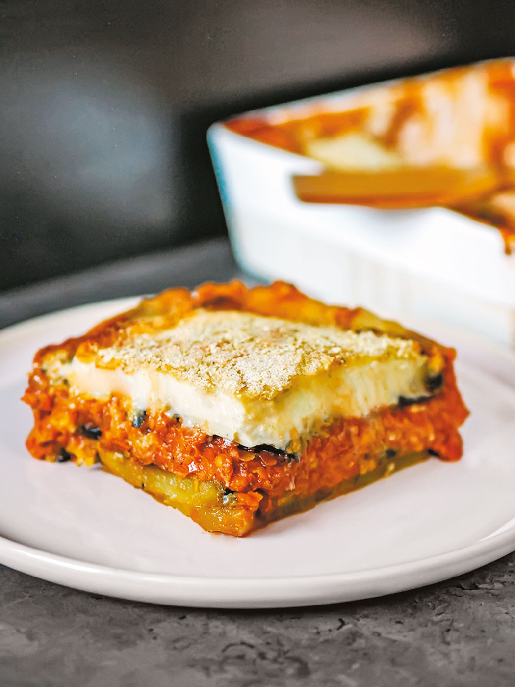 A co z serem? Użyjemy tu oczywiście płatków drożdżowych. Musaka z dużą ilością sera nigdy mi nie odpowiadała. Bardziej doceniałem te, w których na pierwszym planie były ragù, beszamel i smażone warzywa. Tak wegańska musaka staje się sycąca, a jednocześnie letnia – bo o to właśnie w niej chodzi. Gwarantuję, że to danie przywoła wspomnienia z greckich wędrówek i dopisze do nich kolejny akapit.
