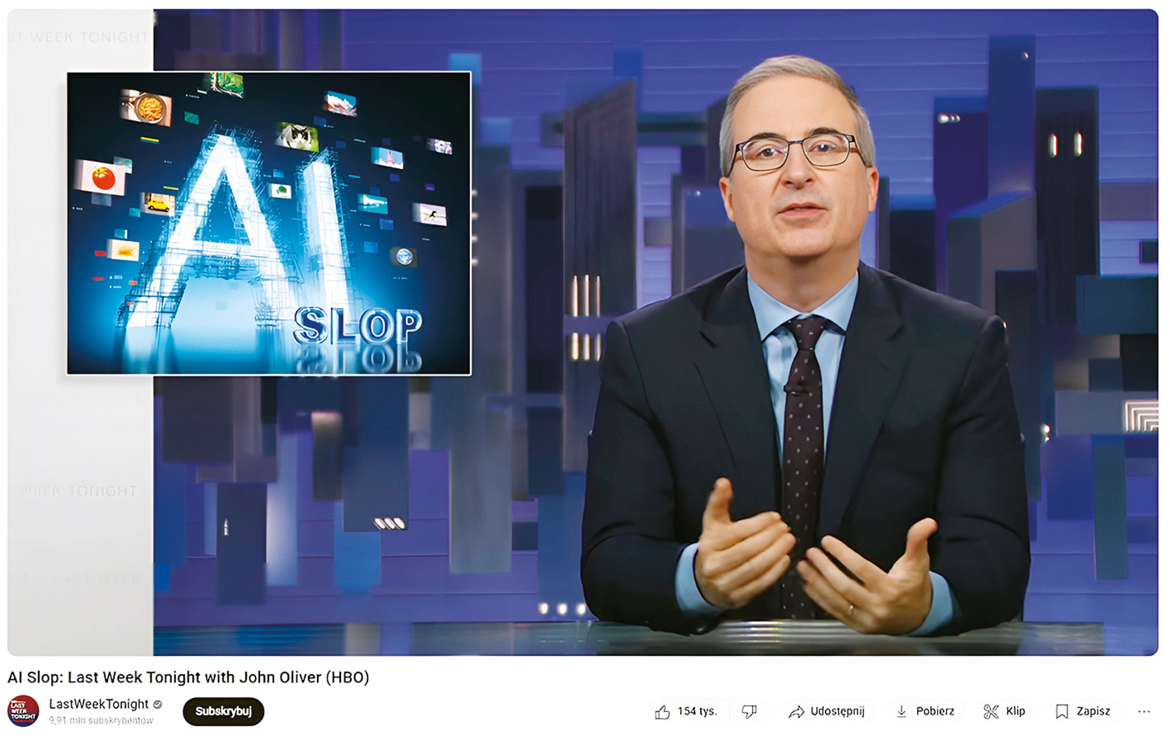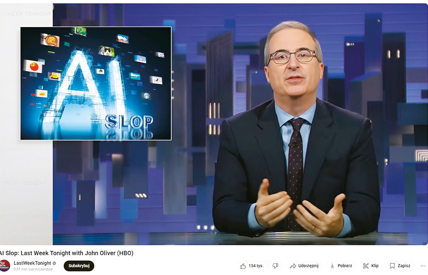 Mówi się, że chatboty to jeszcze nie ten rodzaj sztucznej inteligencji, który miałby podbić ludzkość. Być może jednak źle definiujemy hasło „podbić ludzkość”. AI świetnie sobie radzi z prostymi zadaniami językowymi i kreowaniem obrazków, a być może już to wystarczy, żeby nas podbić – w sensie zapanowania nad naszą uwagą. Cenniejszego zasobu w tych czasach nie mamy. W tę stronę skierował się John Oliver w niedawnym odcinku swojego „Last Week Tonight”, popularyzując określenie „AI slop” na zalew (slop to w jęz. angielskim dosłownie: zalew, pomyje, breja) różnych generowanych z użyciem AI materiałów: memów, przyciągających uwagę obrazków typu brainrot (patrz tekst obok) i fake newsów w mediach społecznościowych.