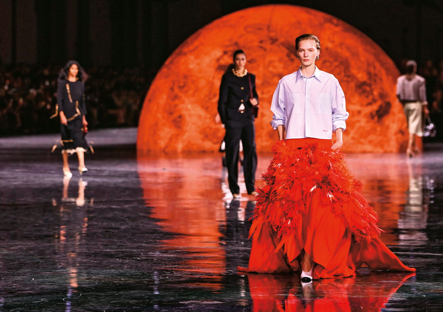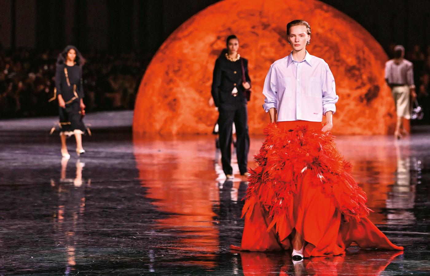 Najwięcej ekscytacji wzbudził debiut Matthieu Blazy’ego u Chanel. Eksprojektant Bottegi Venety, minimalistycznej marki, jednej z ostatnich nieepatujących logo, musiał zmierzyć się z koturnowym monstrum, jakim Chanel się stało jeszcze za rządów Karla Lagerfelda, logomanią wręcz opętanego. Udało się, nadał jej lekkości. W sensie dosłownym, bo dawne tweedowe kostiumy straciły na wadze, a zyskały na wdzięku. Modelki prezentowały nowe typy torebek, skrócone garnitury inspirowane – jak to u Coco – męską garderobą oraz hit tej mimo wszystko zachowawczej kolekcji: wieczorowe koszule uszyte we współpracy z legendarną manufakturą Charvet.
