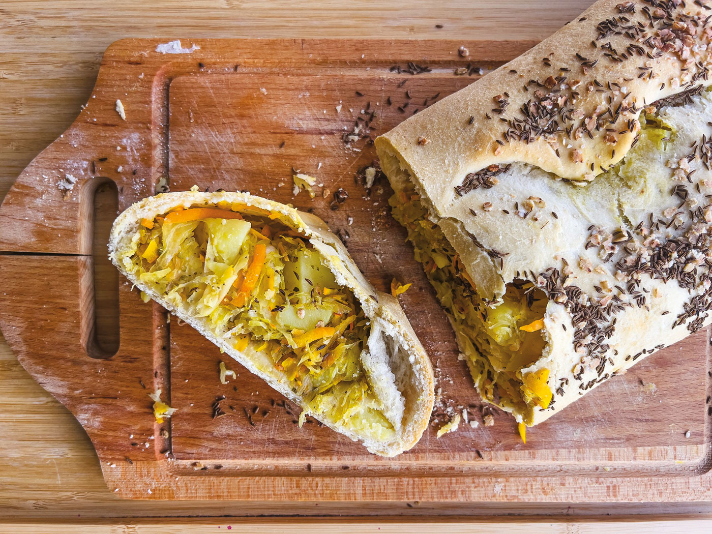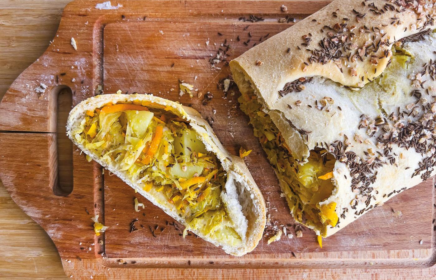 Kulebiak, choć w Polsce kojarzony jest przede wszystkim z Bożym Narodzeniem, moim zdaniem świetnie wpisuje się w jesienny klimat, bo to danie ciepłe, sycące i aromatyczne. Co więcej, jego farsz – w grudniu najczęściej kapusta i grzyby – można modyfikować sezonowo. Jesień to czas, w którym króluje dynia, nie mogło więc jej zabraknąć w moim przepisie. Tym bardziej że świetnie pasuje do kapusty, nadając całości delikatnej słodyczy. Jak zwykle z łatwo dostępnych dyń polecam użyć hokkaido – jest słodkawa, orzechowa w smaku i można jeść ją razem ze skórką.