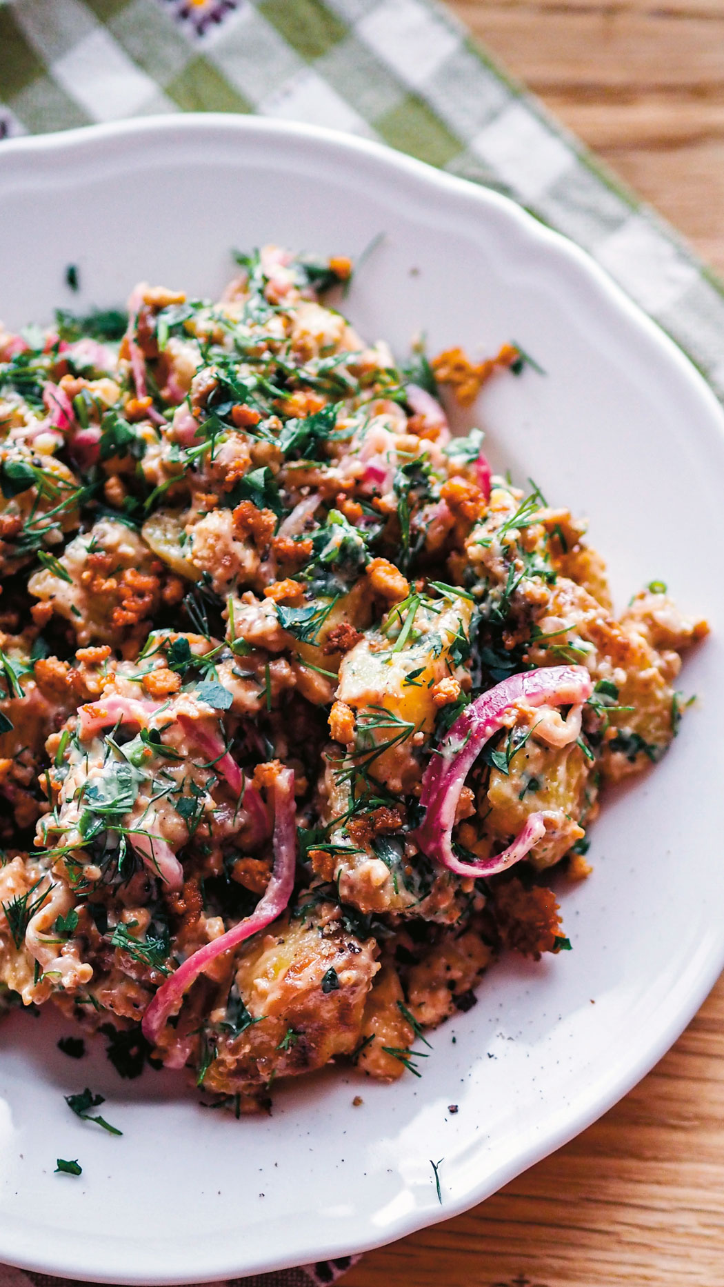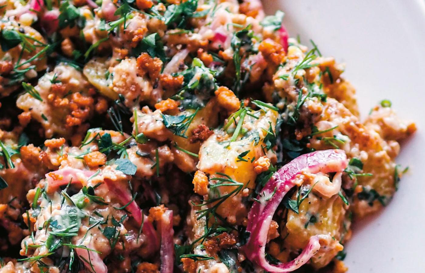 Wiosenną michę przygotowuję więc z piklowaną czerwoną cebulą (która sprawdzi się nie tylko tutaj) i pieczonymi ziemniakami, które najpierw podgotowuję z dodatkiem sody oczyszczonej – w zasadowej wodzie wnętrze ziemniaka pozostaje twardawe, a brzegi stają się poszarpane. Po upieczeniu skorupka uzyskana dzięki sodzie utrzymuje świeżość ziemniaka na dłużej. O to, byśmy nie zanudzili się jednostajną teksturą, dbają także czerwona cebula i mielone z tofu. Do tego moc ziół, dosyć klasyczny dressing i już, mamy to!