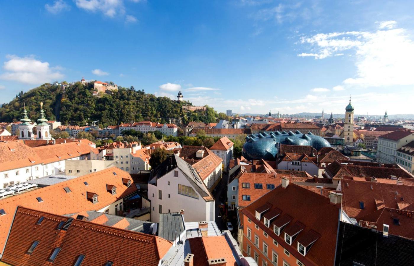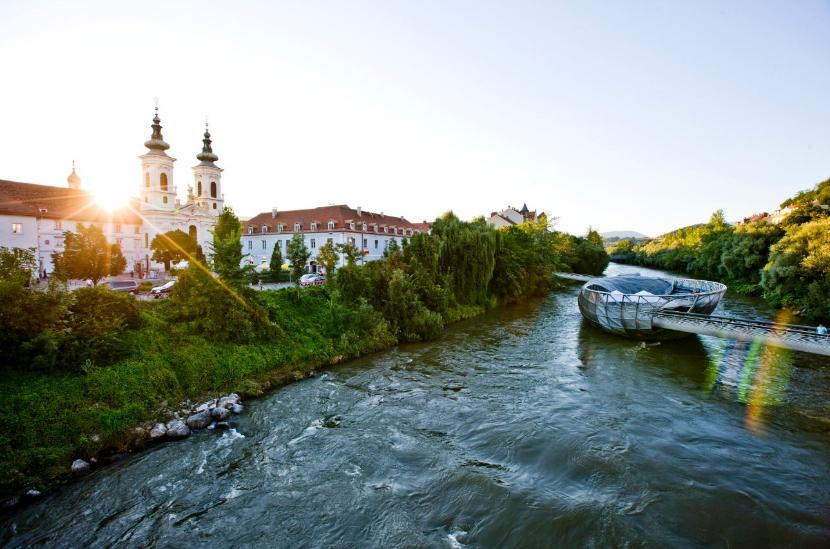W fasadę XIX-wiecznej kamienicy grackiego Starego Miasta „wlewa się” ogromna obła konstrukcja, pokryta pleksiglasowymi płytami – to futurystyczna siedziba galerii Kunsthaus, znana jako „Friendly Alien”. Kompleks łączy się z barokowym pałacem Thinnfeld, a w zasięgu wzroku leżą ruiny średniowiecznego zamku Schlossberg. By do nich dotrzeć, wystarczy przedostać się na drugą stronę rzeki Mury, choćby mostem przechodzącym przez Murinsel – pływającą na wodzie sztuczną wyspę, zaprojektowaną przez nowojorskiego artystę Vito Acconciego. Po drodze mijamy nowoczesne kawiarnie, zielone stoki góry zamkowej i zastępy studentów grackich uniwersytetów. To Graz w pigułce – otoczona naturą, nowoczesna stolica designu, o długiej i bogatej historii.