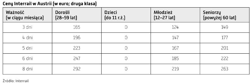 Interrail idealnie nadaje się do dłuższych przejazdów, w przypadku których kupowanie pojedynczych biletów, zwłaszcza w szczycie sezonu, może okazać się kosztowne. Dzieci, młodzież i seniorzy korzystają ze zniżek. Interrail nie zawiera cen miejscówek gwarantujących podróż na siedząco w pociągach takich jak Railjet – trzeba je kupować osobno, ale w Austrii nie są one obowiązkowe w przypadku przejazdów krajowych. Dobrze się w nie zaopatrzyć, jeśli podróżujemy w wyjątkowo popularne dni (np. piątki i niedziele po południu czy na początku lub pod koniec długiego weekendu). Miejscówki na większość pociągów dalekobieżnych kosztują 3 euro i można je rezerwować już pół roku przed datą podróży.