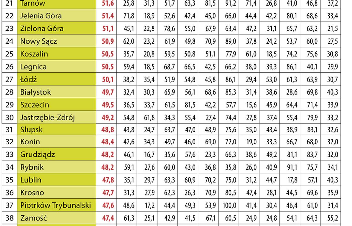 Dla każdej kategorii wybraliśmy od dwóch do czterech różnych kryteriów. Przykładowo dla pracy były nimi stopa bezrobocia i wskaźnik aktywności zawodowej, a dla edukacji – wydatki na oświatę w przeliczeniu na mieszkańca, średni wynik egzaminu gimnazjalnego z języka polskiego i matematyki oraz odsetek dzieci w wieku 3–4 lat chodzących do przedszkoli. W przypadku każdego kryterium miasto z najlepszym wynikiem otrzymywało 100 pkt, a to z najgorszym – 0. Dla innych miast wyliczaliśmy wartość pośrednią. W przypadku większości kryteriów (np. liczba lekarzy, frekwencja w wyborach, przeciętne wynagrodzenie) za najlepszy uznawaliśmy wynik najwyższy. Jednak w przypadku liczby samobójstw, stopy bezrobocia czy masy odpadów najlepszy był oczywiście wynik najniższy.