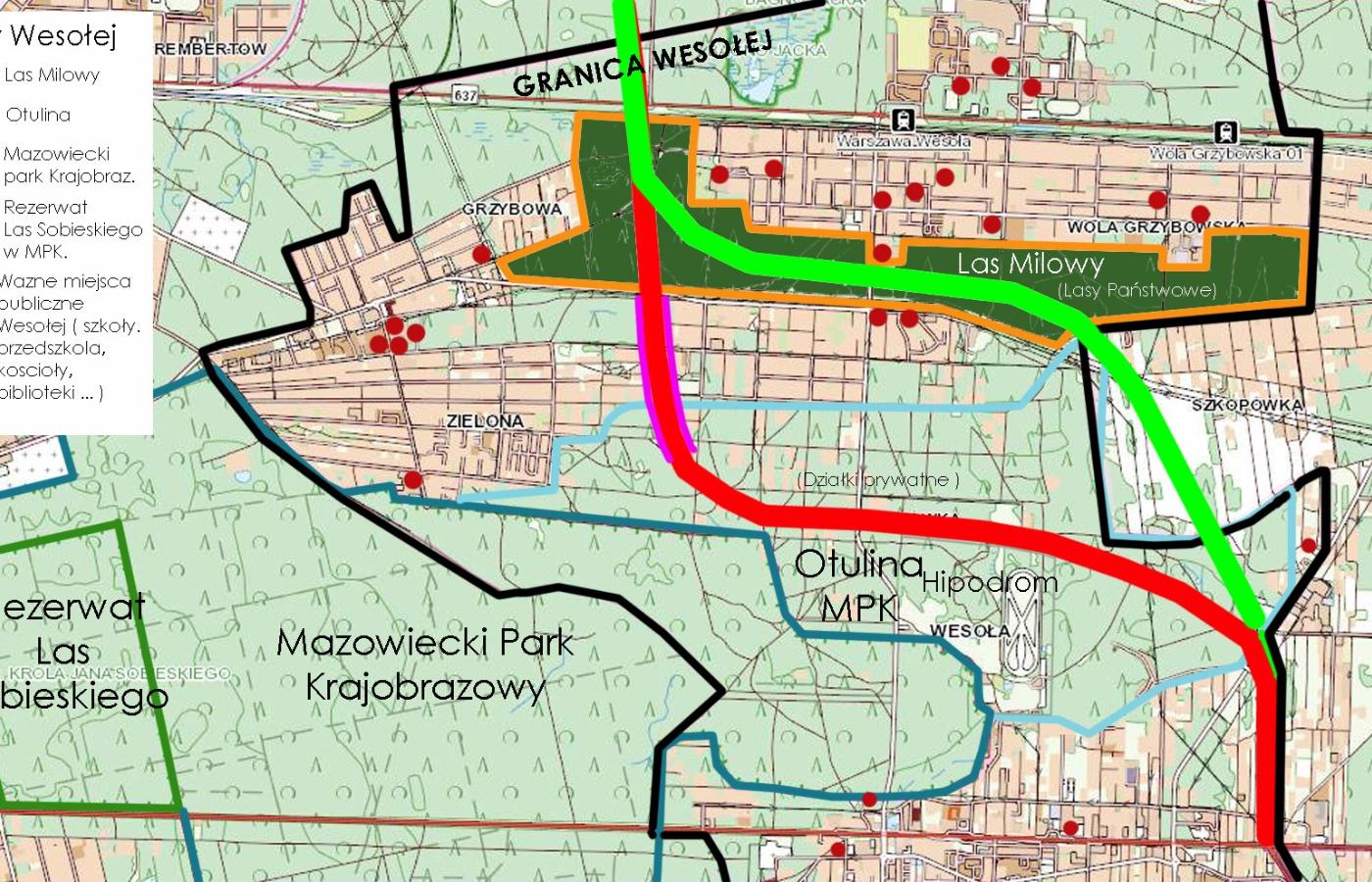 Celowo nie wspominałem w tym porównaniu o zagrożonych terenach zielonych w Wesołej. Przeciwnicy wariantu zielonego piszą o „wewnętrznym parku o wdzięcznej nazwie Las Milowy” dodatkowo jako o jedynym publicznym terenie zielonym w dzielnicy. Nie mogę potwierdzić ani, że las milowy to park, a tym bardziej, że jedyny. Wesoła to dzielnica Warszawy, której powierzchnia w ok. 70% składa się z terenów leśnych. Jak najbardziej istnieje w Wesołej publiczny zielony teren rekreacyjny i to jedyny w swoim rodzaju. Jest to Mazowiecki Park Krajobrazowy z otuliną o walorach przyrodniczych, w niczym nieustępujących tym w MPK. Cała Warszawa zazdrości dzielnicy Wesoła i dzielnicy Wawer prawdopodobnie największych zwartych terenów leśnych w Warszawie, gdzie część tych terenów w sąsiedniej dzielnicy Wawer ma status Natura 2000. Właśnie alternatywny wariant czerwony bezpowrotnie zdewastuje Mazowiecki Park Krajobrazowy i doszczętnie zniszczy jego otulinę na terenie Wesołej.