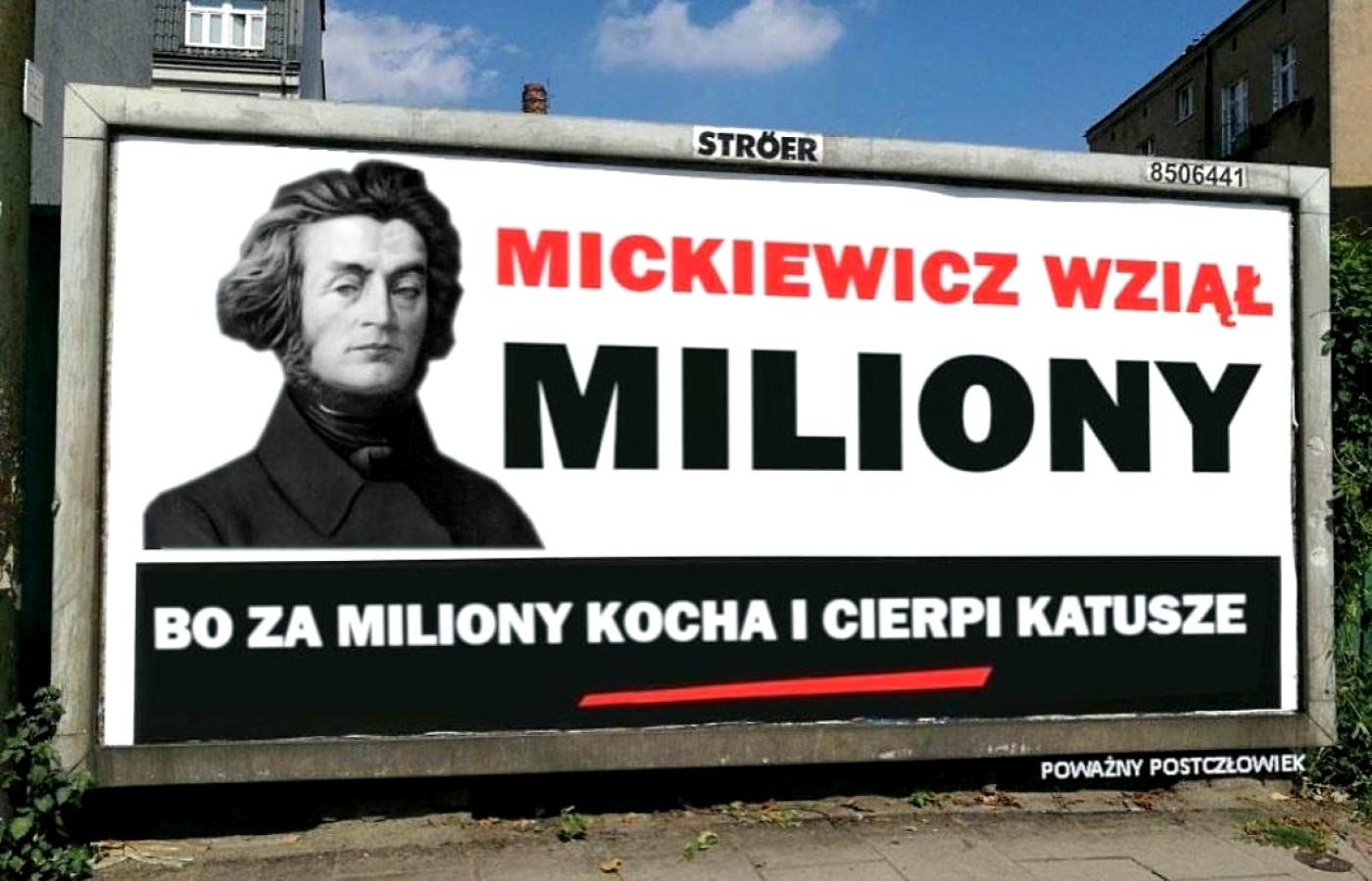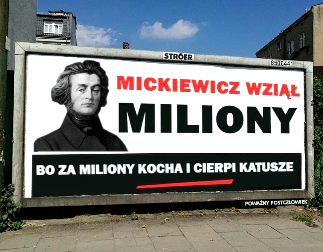 Jeśli celem opozycji było stworzenie generatora memów, to billboardy z Jarosławem Kaczyńskim odniosły spektakularny sukces. Zaczęło się od wyrzucania PiS-owi, że wziął miliony, a „wszystko drożeje” i takie tam, a szybko przerodziło się w paradę obrazków z najróżniejszymi postaciami, od pisarza George’a R.R. Martina, który „wziął miliony, a »Wichrów zimy« dalej nie ma”, przez wiedźmina Geralta, który „wziął miliony, a »Cyberpunku 2077« dalej nie ma”, po Adama Mickiewicza, który „wziął miliony, bo za miliony kocha i cierpi katusze”. Ubaw po pachy.