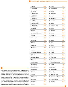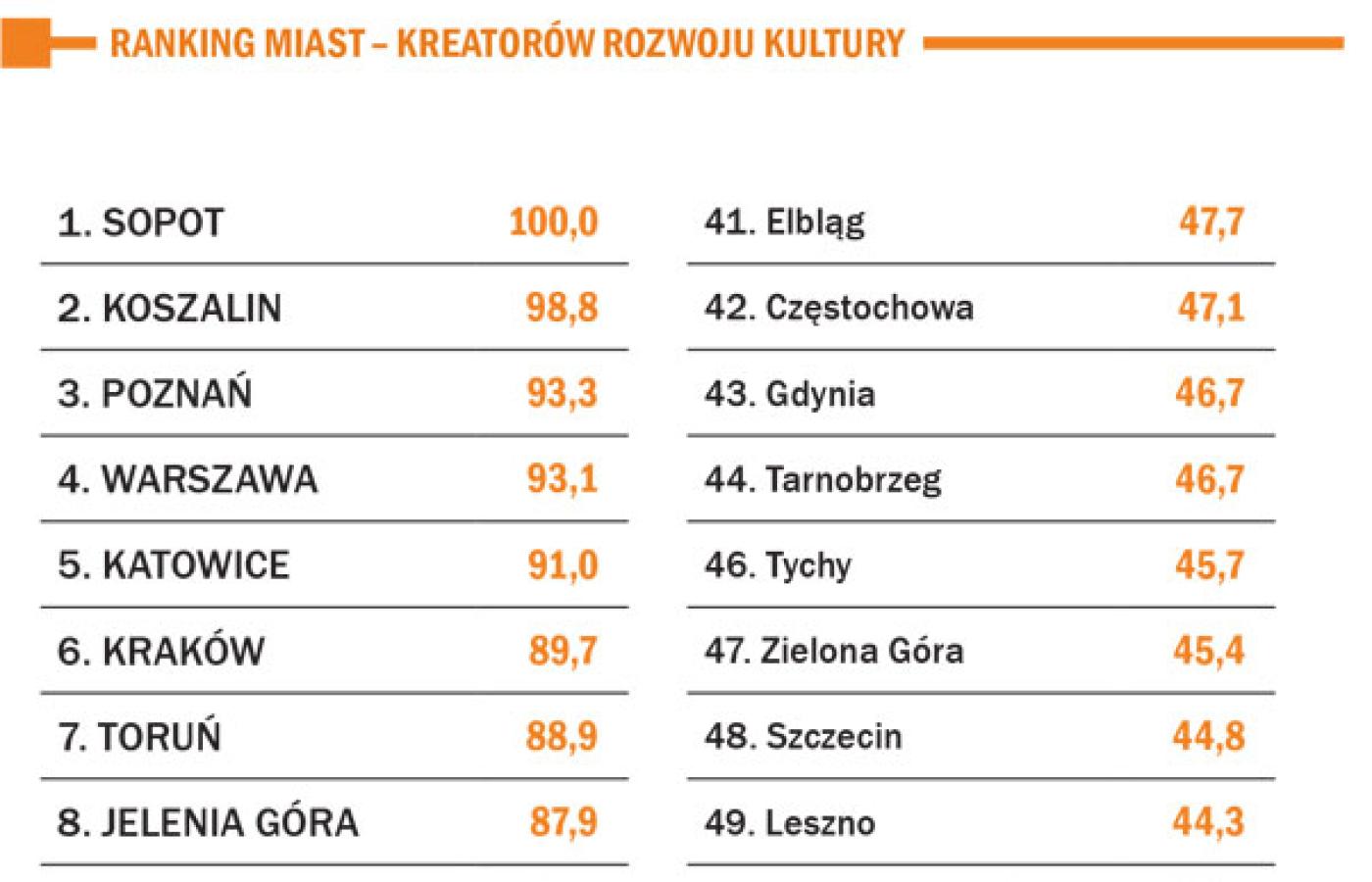 W tym rankingu ujęto 100 największych miast (my prezentujemy tu – podobnie jak w przypadku pozostałych rankingów w numerze – pozycje, jakie zajęły w tej setce miejscowości na prawach powiatu). Autorzy wzięli pod uwagę takie kwestie, jak: dostępność kultury, działalność miejskich instytucji kultury, środki przeznaczane na działalność kulturalną oraz zaangażowanie mieszkańców w działalność w organizacjach pozarządowych albo grupach nieformalnych. W porozumieniu z 32 ekspertami pogrupowali je według ważności, przypisując im wagę 50, 30 i 20 proc. Końcowa pozycja miasta w rankingu nie jest więc wynikiem sumowania punktów, tylko zastosowania wzoru uwzględniającego znaczenie poszczególnych kryteriów dla jakości polityki kulturalnej.