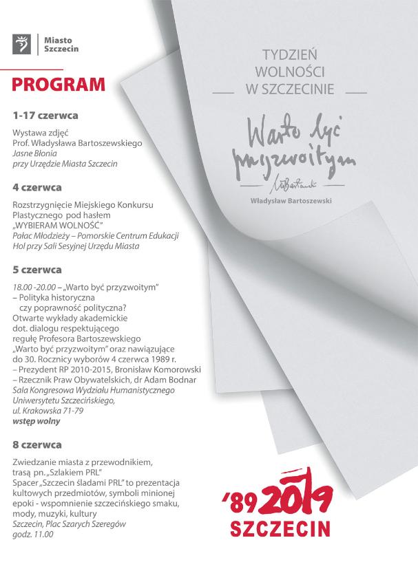 Z tej okazji miasto przygotowało wiele atrakcyjnych wydarzeń, które nie sposób było zorganizować i przeprowadzić w ciągu jednego dnia. Mnogość i różnorodność programu mają być zachętą dla mieszkańców i turystów. Pierwszy tydzień czerwca w Szczecinie zdominują wydarzenia związane z 30. rocznicą wyborów parlamentarnych. Chodzi przede wszystkim o uchwycenie idei, klimatu i życiowych postaw. 1 czerwca na terenie Jasnych Błoni, czyli reprezentacyjnego placu w samym sercu miasta, odbędzie się wernisaż fotografii poświęcony prof. Władysławowi Bartoszewskiemu. Będą to unikatowe zdjęcia, na których uwieczniono legendarną postać zarówno w sytuacjach prywatnych, jak i zawodowych, podczas publicznych wystąpień. 4 czerwca, w samo południe (nawiązanie do kultowego plakatu z Garym Cooperem) w Galerii Prezydenckiej szczecińskiego magistratu odbędzie się uroczyste rozstrzygnięcie Miejskiego Konkursu Plastycznego dla uczniów szczecińskich szkół, który odbył się pod hasłem „Wybieram Wolność”. Dzień później rozpoczną się otwarte wykłady akademickie związane z rocznicą i mottem prof. Bartoszewskiego – „Warto być przyzwoitym”. Wśród uczestników wydarzenia będą m.in.: Rzecznik Praw Obywatelskich dr Adam Bodnar oraz były Prezydent RP Bronisław Komorowski. Zwieńczeniem tegorocznych obchodów będzie zwiedzanie miasta z przewodnikiem. „Szlakiem PRL”, czyli wyjątkowy spacer ulicami Szczecina, to prezentacja kultowych przedmiotów i symboli minionej epoki oraz wspomnienie mody i muzyki sprzed kilkudziesięciu lat. W pewnym sensie będzie to słodko-gorzka podróż w czasie, bo choć momentami może wzbudzić sentyment i tęsknotę za tym, co przeminęło, to jednak osadzona jest w realiach, gdy wolność była utopią.