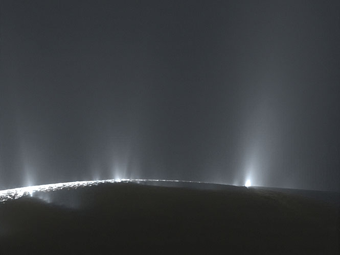 Bliskim sąsiadem pierścieni jest Enceladus. Mimo małych rozmiarów (ok. 500 km średnicy) to obiekt aktywny geologicznie, co zawdzięcza grawitacyjnemu oddziaływaniu sąsiada, księżyca Dione. Poddawana naprężeniom powierzchnia Enceladusa przesuwa się, a powstające ciepło utrzymuje w stanie płynnym olbrzymi podziemny ocean. Przy południowym biegunie Enceladusa znajdziemy Tygrysie Pasy – cztery długie, niemal równoległe ryfty tektoniczne, z których tryskają strugi oceanicznej wody. Słaba grawitacja sprawia, że gejzery sięgają kosmosu. Gdy sonda Cassini wykonała niski przelot nad tym rejonem, krótki film pokazujący zbliżanie się do gigantycznych fontann wody wywołał furorę w internecie. Co prawda przedstawiał gejzery bijące z dołu do góry, ale w kosmosie wystarczy obrócić sondę, aby uzyskać efekt niewiele ustępujący podniebnym wodospadom z „Awatara”.