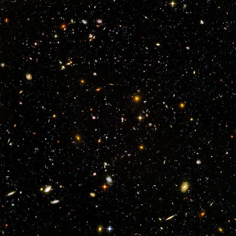 Ponieważ światło rozchodzi się ze skończoną prędkością, patrząc daleko w przestrzeń zaglądamy jednocześnie w odległą przeszłość. Analizując wyniki obserwacji przeprowadzonych m.in. za pomocą teleskopu Hubble’a możemy prześledzić, jak zmieniał się Wszechświat z upływem czasu. Pierwsze galaktyki, które ukształtowały się w przestrzeni kosmicznej kilkaset milionów lat po Wielkim Wybuchu, były dużo mniejsze od widocznych w naszej okolicy (a więc w zaawansowanej fazie ewolucji Wszechświata). Często zderzały się ze sobą i zlewały w większe obiekty; wytwarzały też gwiazdy w tempie nawet tysiąc razy większym niż obecnie. Z upływem czasu uspokajały się, średnie odległości między nimi rosły, a zderzenia stawały się coraz rzadsze.