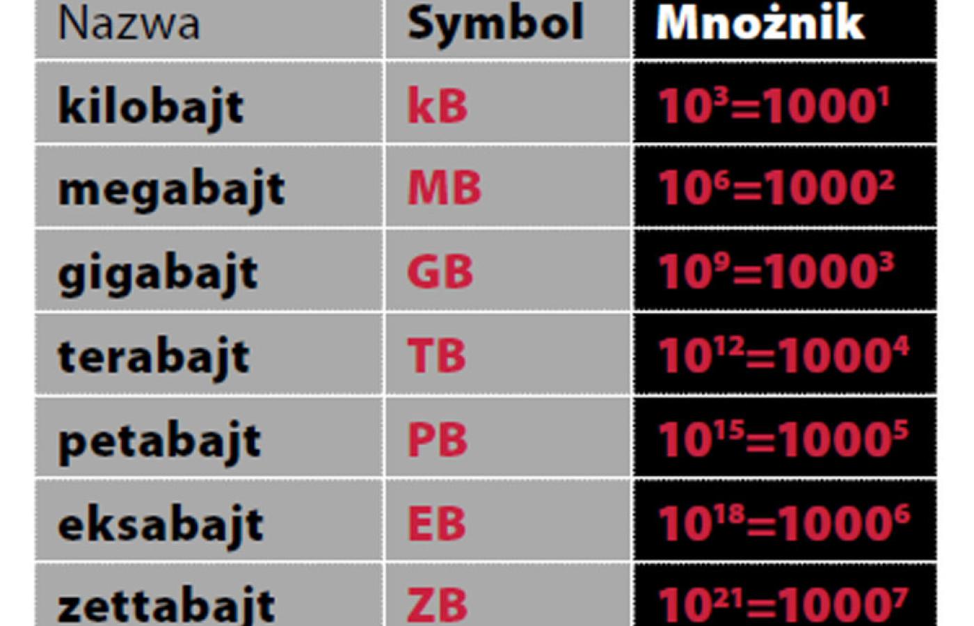 W cyfrowym świecie najmniejsza porcja informacji to bajt. Sam tekst tego artykułu zajmuje (potocznie – waży) około 10 kilobajtów, czyli ma 10 tys. znaków ze spacjami. W rzeczywistości zajmuje zwykle więcej pamięci – zależnie od formatu, w którym jest zapisany. 20 lat temu na dyskietce 3,5-calowej o pojemności 1,44 megabajta (wówczas powszechny nośnik danych) zmieściłoby się ok. 140 takich artykułów. Wydawało się wtedy, że to zupełnie wystarczy. Dziś nosimy przy sobie na kartach pamięci telefonów komórkowych i aparatów fotograficznych, w odtwarzaczach muzycznych, pendrive'ach, nie mówiąc już o twardych dyskach naszych laptopów czy też iPadów gigabajty danych. Podręczną pamięcią staje się Internet, gdzie przechowujemy zdjęcia, listy, dokumenty, filmy i ulubione piosenki. Google oferuje za darmo przestrzeń dyskową o pojemności 10 gigabajtów, zaś za niewielką dopłatą uzyskamy cyfrowy schowek mogący pomieścić 80 gigabajtów.