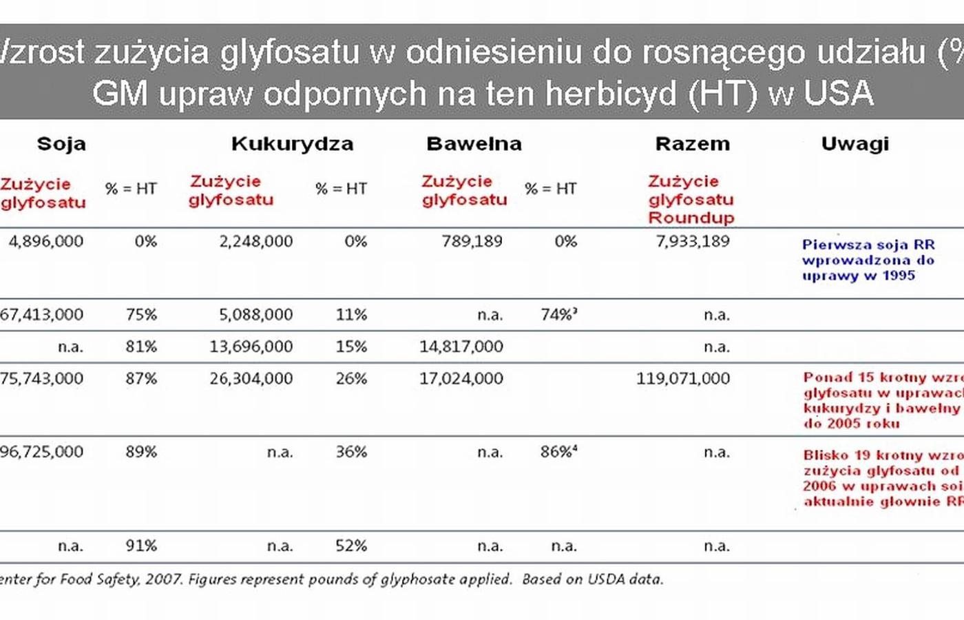 Red. Rotkiewicz pisze, że na terenach, gdzie uprawia się GMO, spada zużycie herbicydów i pestycydów. Przeczy temu raport Charlesa Benbrooka (http://www.organiccenter.org/reportfiles/GE13YearsReport.pdf ) podsumowujący 13 lat stosowania technologii GMO w rolnictwie amerykańskim. W oparciu o dane Amerykańskiego Departamentu Rolnictwa raport wylicza znaczący wzrost zużycia glyfosatu (Roundup) przy równoczesnym spadku zużycia innych herbicydów, przy czym łączne zużycie zaczyna wykazywać tendencję wzrostową. Nie należy również zapominać, że odmiany Bt same produkują naturalny pestycyd, toksynę Bt, w ilościach znacznie przewyższających ilości stosowane w opryskach i o większej trwałości niż w przypadku oprysków. Rosnące wraz z przyrostem areału upraw odpornych na herbicyd zużycie glyfosatu przedstawia załączona tabela. Warto wiedzieć, że firma Monsanto zarabia dwa razy więcej na sprzedaży herbicydów niż na sprzedaży ziarna GMO (przykładowo, w 2003 zarobiła 3.1 miliarda USD na sprzedaży pestycydów i 1.6 miliarda na sprzedaży ziarna).