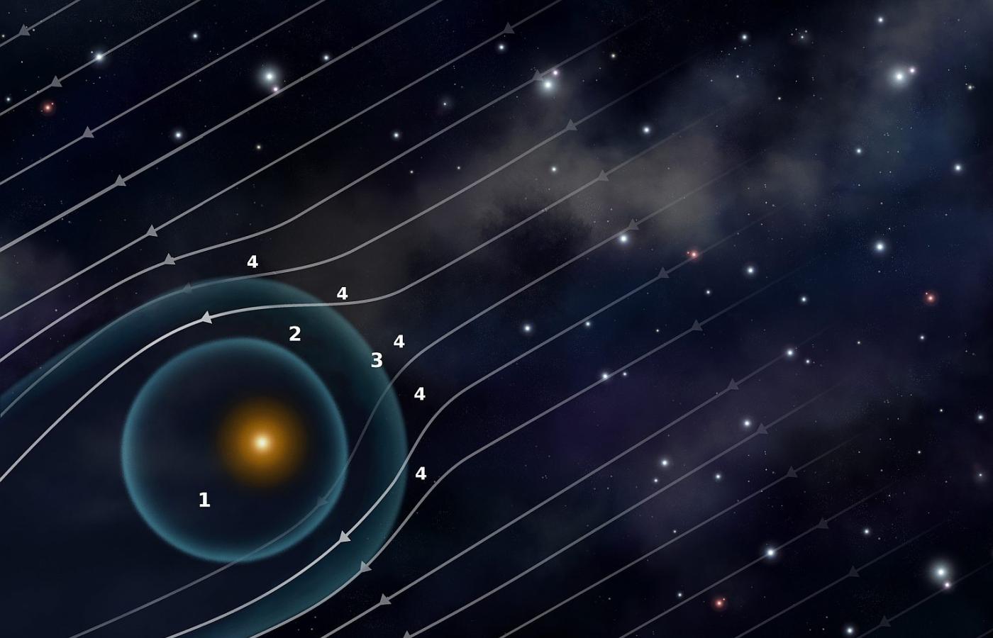 Problem rozwiązano w zupełnie inny sposób: Układ Słoneczny jest zanurzony w niezwykle rozrzedzonej mieszaninie gazów i mikroskopijnych ziaren lodowo-pyłowych, zwanej ośrodkiem międzygwiazdowym. W ciągu godziny Słońce traci średnio 5 mld ton materii, która w postaci wiatru słonecznego ucieka odeń z prędkością kilkuset kilometrów na sekundę w przestrzeń międzygwiazdową. Wiatr ten rozpycha ośrodek międzygwiazdowy i wytwarza w nim wypełniony słoneczną materią pęcherz, nazywany przez astronomów heliosferą. Powierzchnię heliosfery – tzw. heliopauzę – przyjęto uważać za granicę Układu Słonecznego. Tej definicji trudno już cokolwiek zarzucić, ponieważ to właśnie na heliopauzie wiatr słoneczny styka się z ośrodkiem międzygwiazdowym. Nawiasem mówiąc, choć miliardy ton na godzinę wydają się ilością całkiem pokaźną, dla Słońca jest to utrata wręcz niezauważalna: przy stałej intensywności wiatru znikłoby dopiero za sto bilionów lat.