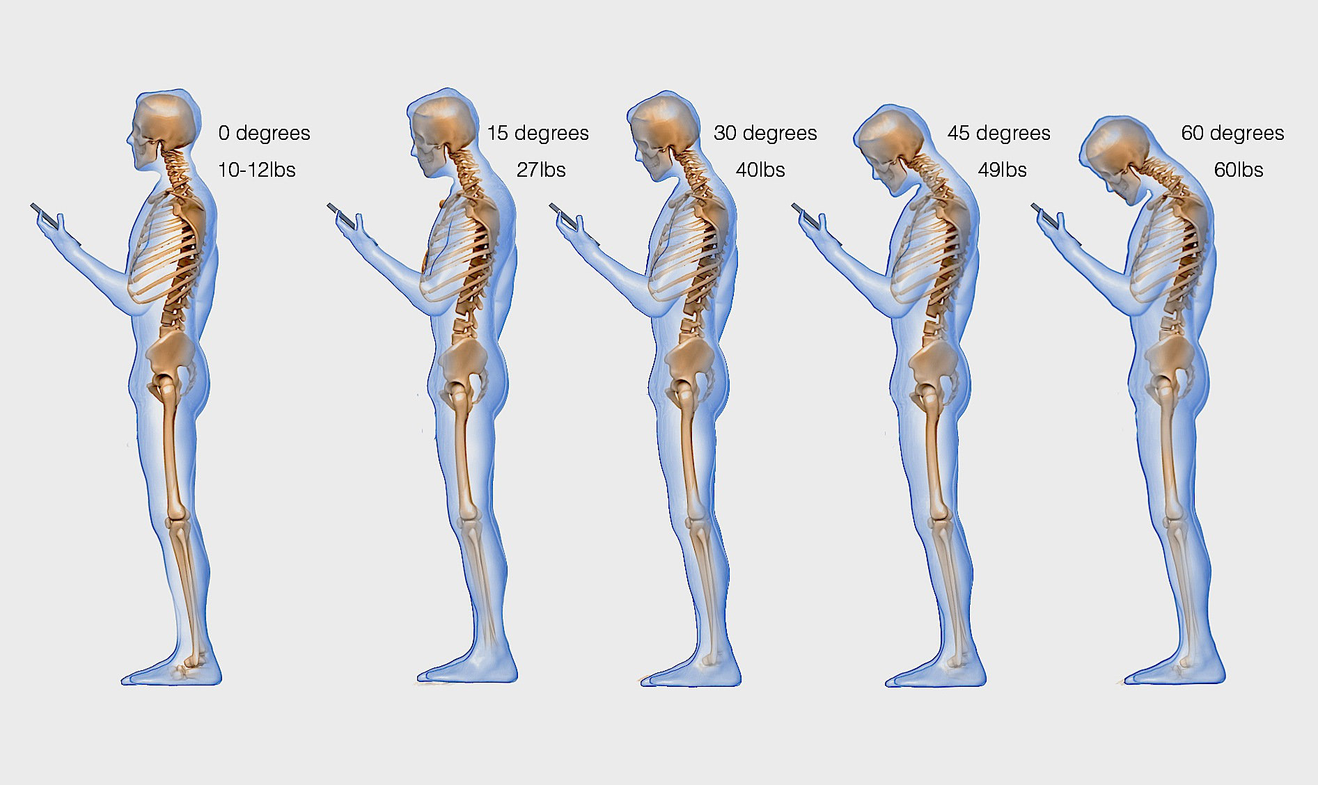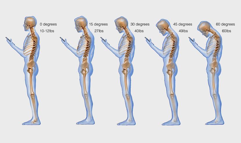 W opublikowanym w magazynie „Surgical Technology International” artykule dr Kenneth Hansraj przekonuje, że patrzenie w telefon poważnie obciąża kręgosłup. Chodzi przy tym o pozycję, jaką zwykle przyjmujemy – patrzymy w dół i mimowolnie się pochylamy. A im bardziej się pochylamy, tym obciążenie wyższe. Jak na załączonym obrazku: pochylenie pod kątem 60 stopni to dla naszej szyi nawet 27-kilogramowe obciążenie (i odpowiednio: 45 stopni równa się 22 kilogramom, 30 stopni – 18, 15 stopni – 12).