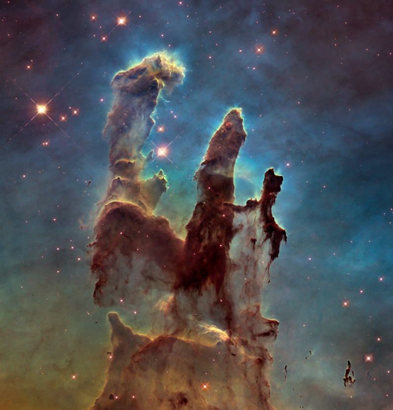 Dzięki nowym obserwacjom Hubble’a dowiadujemy się jednak, że Filary są również obszarami destrukcji. Gaz i pył Filarów są rozwiewane przez intensywną radiację młodych gwiazd i erodują pod wpływem potężnych wiatrów gwiazdowych. Dowodzą tego jasno-niebieskie otoczki wokół tych niezwykłych kształtów, które są mocno podgrzaną materią, wyparowującą w przestrzeń kosmiczną.