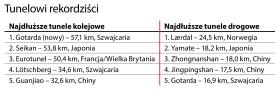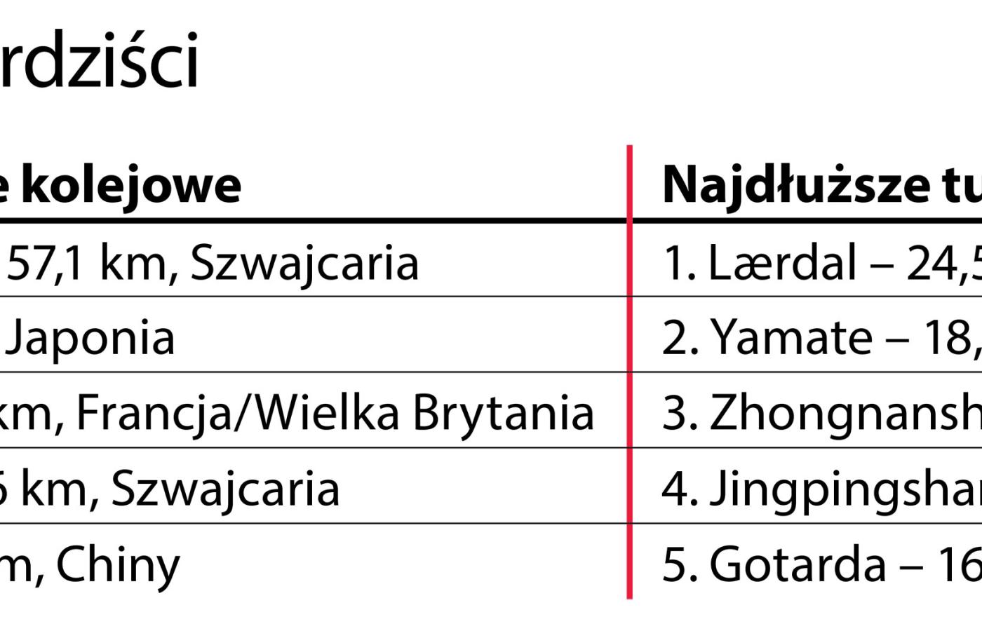 Otwarcie tunelu było dla Szwajcarów niezwykłym świętem. 1 czerwca tamtejsze koleje SBB przejęły oficjalnie kontrolę nad najdłuższym na świecie, 57-kilometrowym tunelem, a kilka dni później pokazały wszystkim chętnym. Organizatorzy imprez związanych z otwarciem nowego tunelu Gotarda spodziewali się nawet 100 tys. gości, którzy mieli okazję pojechać w najdłuższą na świecie podziemną podróż pociągiem. To była chwila narodowej dumy i dowód, że Szwajcarzy wciąż potrafią dokonać rzeczy niezwykłych. Tak samo jak w 1881 r., gdy otwierali pierwszy kolejowy tunel pod masywem św. Gotarda. Miał 15 km długości i wówczas też był najdłuższy na świecie. Ten tytuł już dawno stracił, ale teraz odzyska go dla Szwajcarii jego młodszy brat. Zdetronizuje kolejowy tunel Seikan, łączący japońskie wyspy Hokkaido i Honsiu, który ma niespełna 54 km. Okaże się także wyraźnie dłuższy od 50-km tunelu pod kanałem La Manche, otwartego w 1994 r.