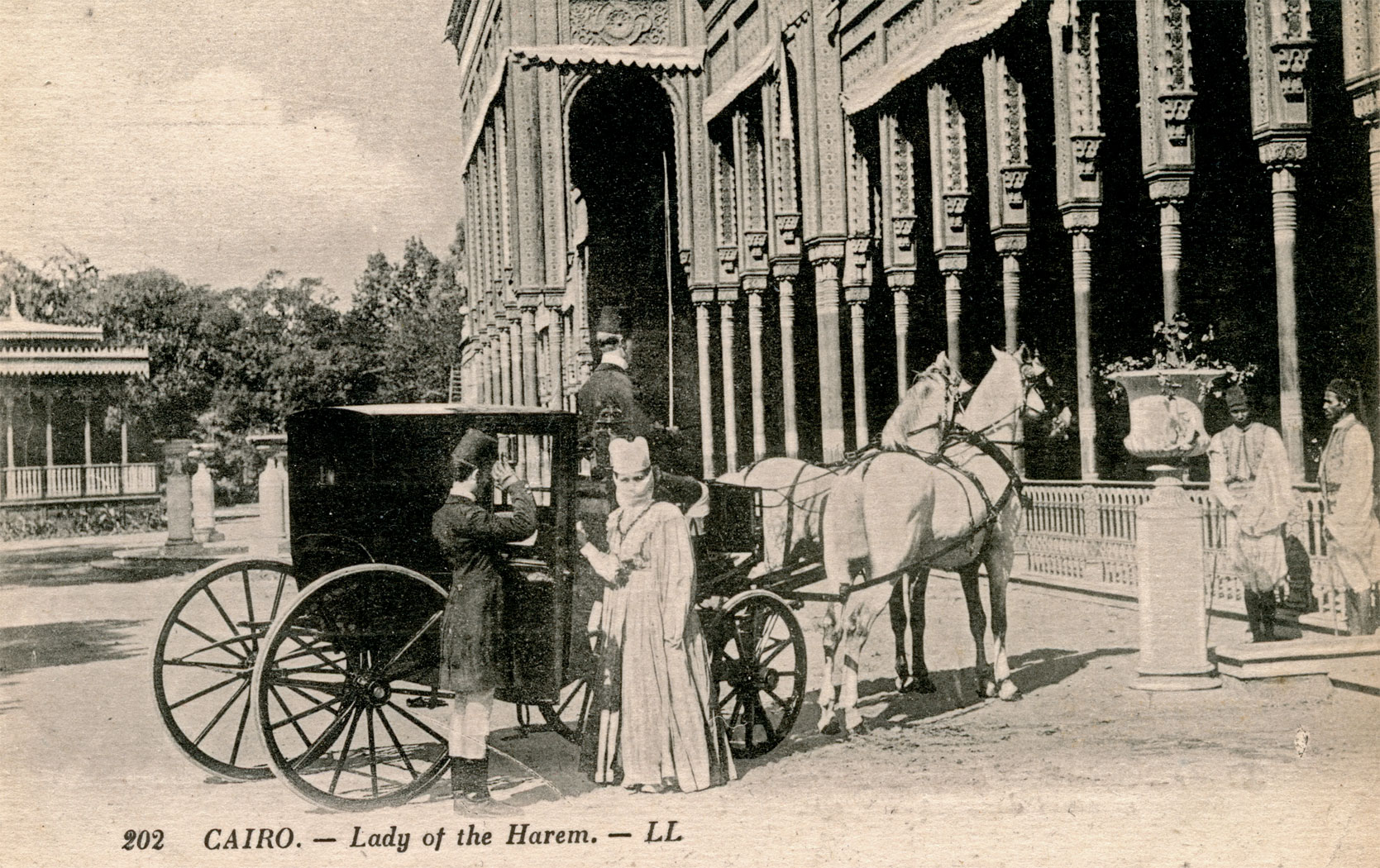 Zdjęcia wykonane przez znane pracownie fotograficzne (Leon et Levi, Lehner and Landrock czy Raphael Tuck) dzielą się na trzy grupy – pierwsza to autentyczne zdjęcia dam haremowych z Konstantynopola, Kairu i Maghrebu na spacerze; druga to pozowane portrety orientalnych kobiet w stylizowanych na wnętrza haremów pomieszczeniach; a trzecia – robione w europejskich atelier orientalizujące scenki erotyczne. Tylko część zdjęć ma charakter reportażowy, wiele odzwierciedla fantazje na temat haremowego życia. Seria fotografii przedstawiająca europejskiego gentlemana, który na różne sposoby pieści nagą odaliskę, doskonale ilustruje wyobrażenia Europejczyków na temat swobody seksualnej kobiet na Bliskim Wschodzie.