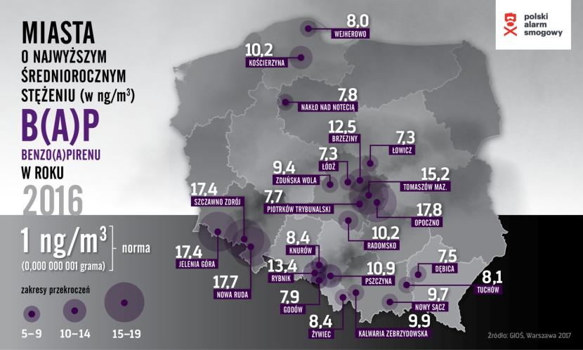 Polski Alarm Smogowy przeanalizował dane z 2016 roku zebrane przez stacje pomiarowe Głównego Inspektoratu Ochrony Środowiska. Wyniki są szokujące, mimo że wyniki uwzględniają tylko te miasta, w których znajdują się stacje pomiarowe. Brak informacji o danym mieście nie musi zatem oznaczać, że jego mieszkańcy oddychają czystym powietrzem. Po prostu nikt nie monitoruje poziomu zanieczyszczeń w ich okolicy.