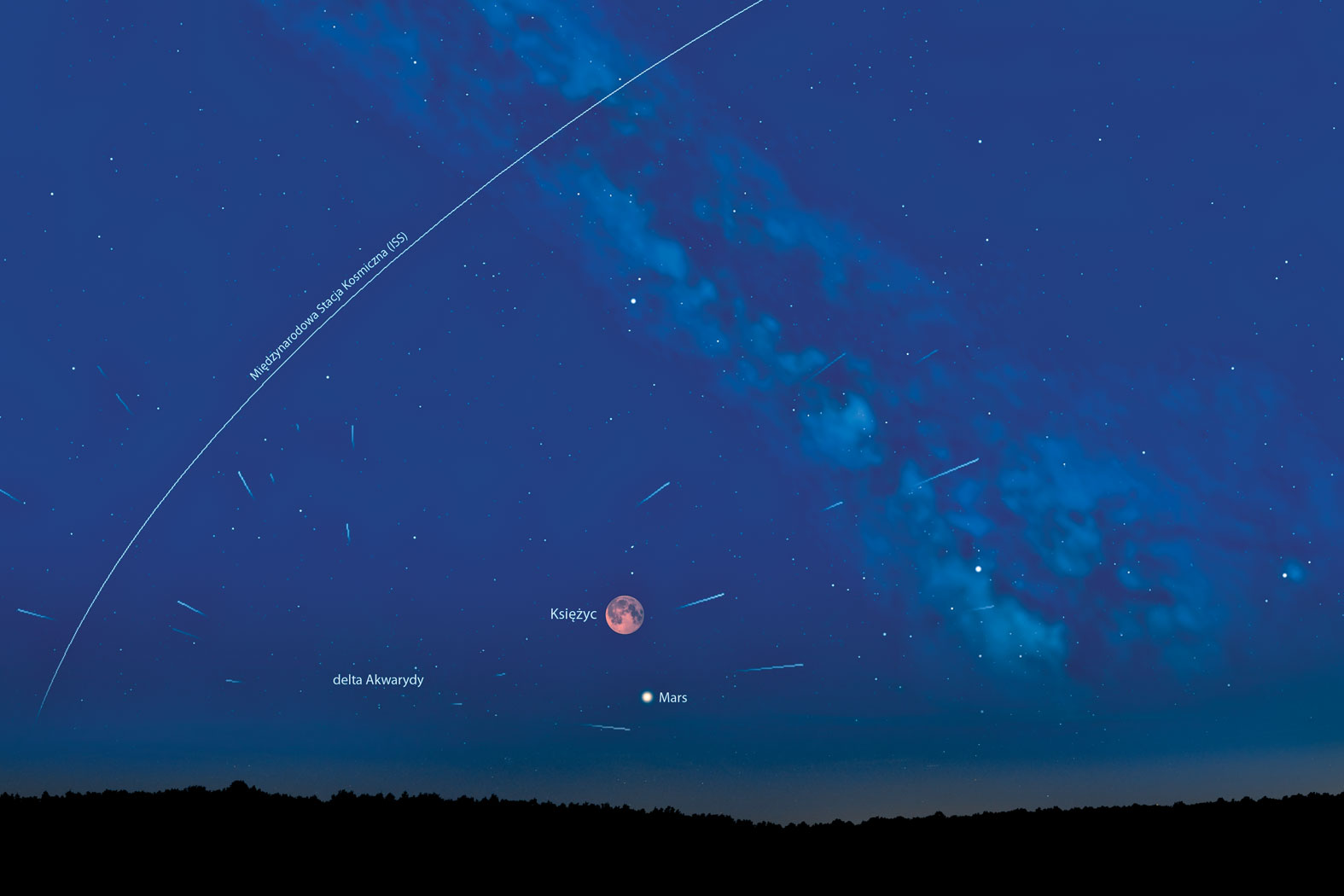 Po godz. 20.45 przyjrzyjmy się uważnie linii wolnego od drzew i budynków południowo-wschodniego horyzontu, zza którego wyłania się Księżyc. Jego tarcza będzie jakby „nadgryziona” z lewej strony. Tak rozpocznie się zaćmienie. Wraz z nabieraniem wysokości przez naszego satelitę cień Ziemi pochłaniać go będzie coraz bardziej, by o 21.30 rozpocząć fazę całkowitą. Srebrny Glob przybierze krwiste oblicze, a ponieważ wciąż będzie niewysoko nad widnokręgiem, jego „krwistość” powinna być intensywna.