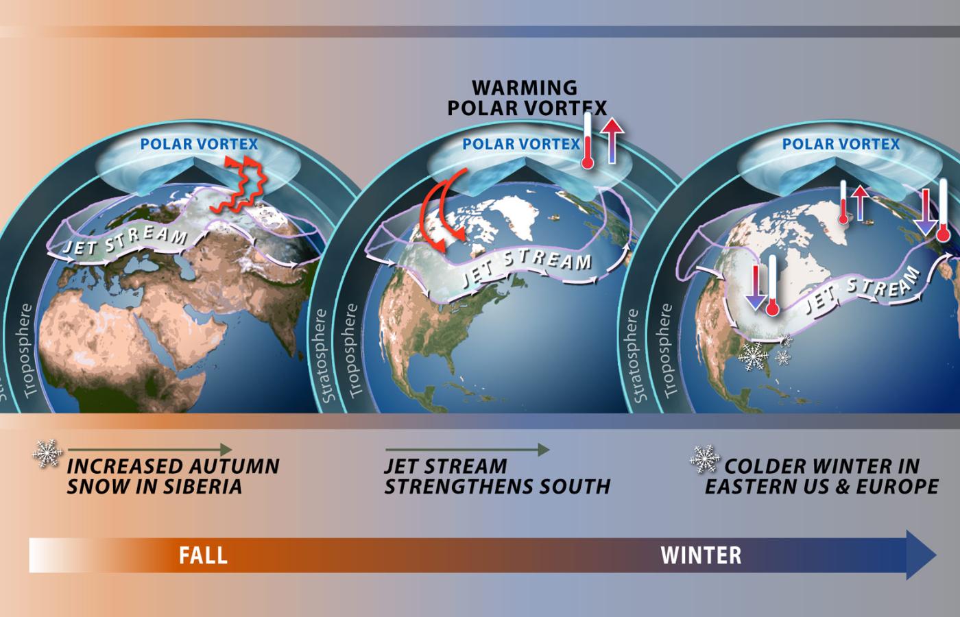 Powodem tak nagłego i ostrego ataku zimy w środkowych i północnych stanach USA jest niskociśnieniowy wir polarny, który zwykle krąży sobie spokojnie nad Arktyką, ponieważ trzyma go w ryzach tzw. prąd strumieniowy. Prąd strumieniowy z kolei to stały i wąski strumień bardzo szybko przemieszczającego się powietrza z zachodu na wschód, niemal poziomy, pędzący z prędkością ponad 100 km/godz. na wysokości 10–12 km nad powierzchnią ziemi. To wyraźny pierścień stanowiący barierę dla chłodnych mas arktycznych, które nie mogą przedostawać się niżej, na średnie szerokości geograficzne. Istnieją dwa główne prądy strumieniowe w okolicach polarnych obu półkul i dwa mniejsze po obu stronach równika, tzw. międzyzwrotnikowe.