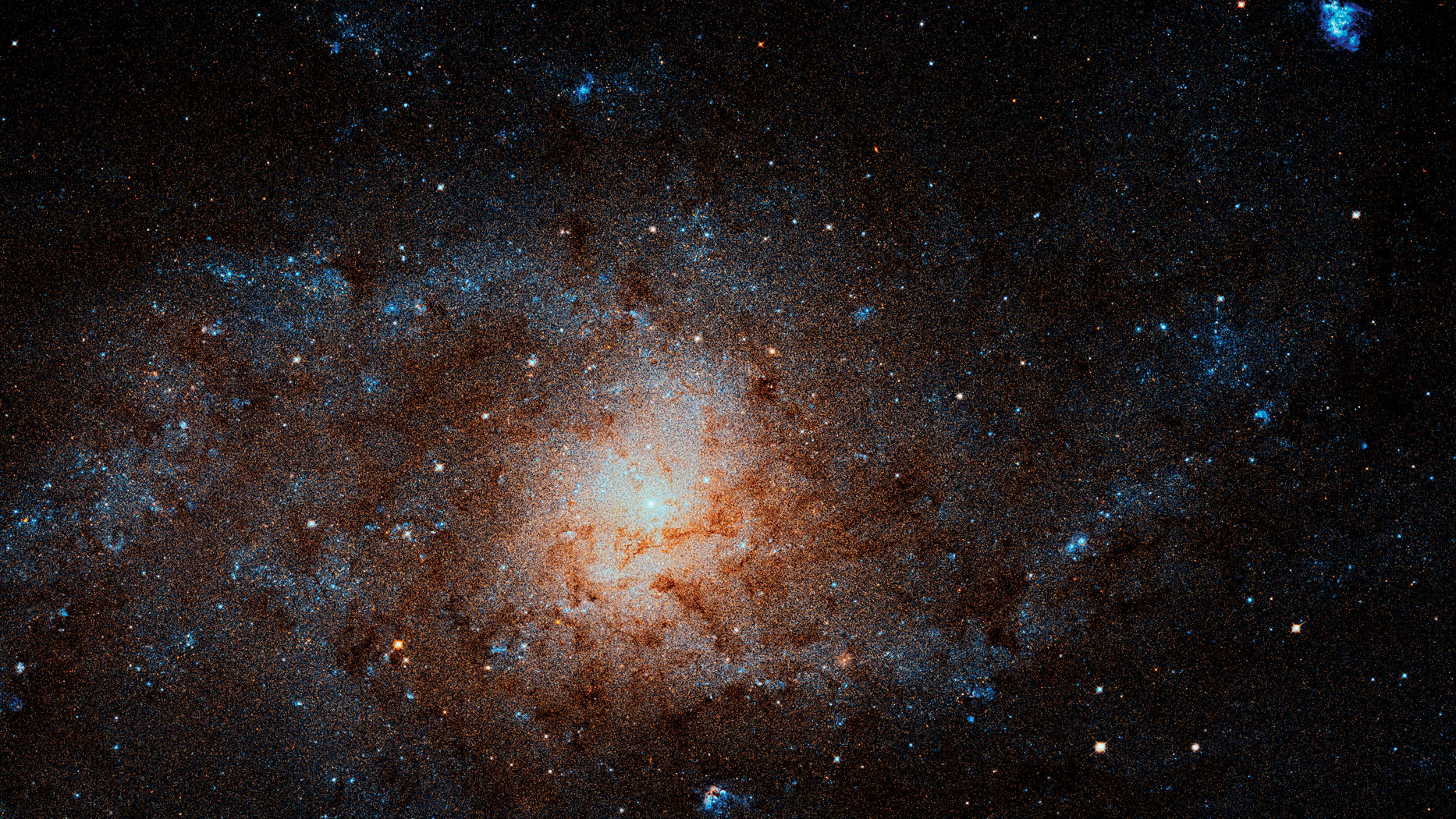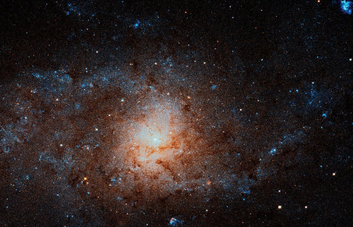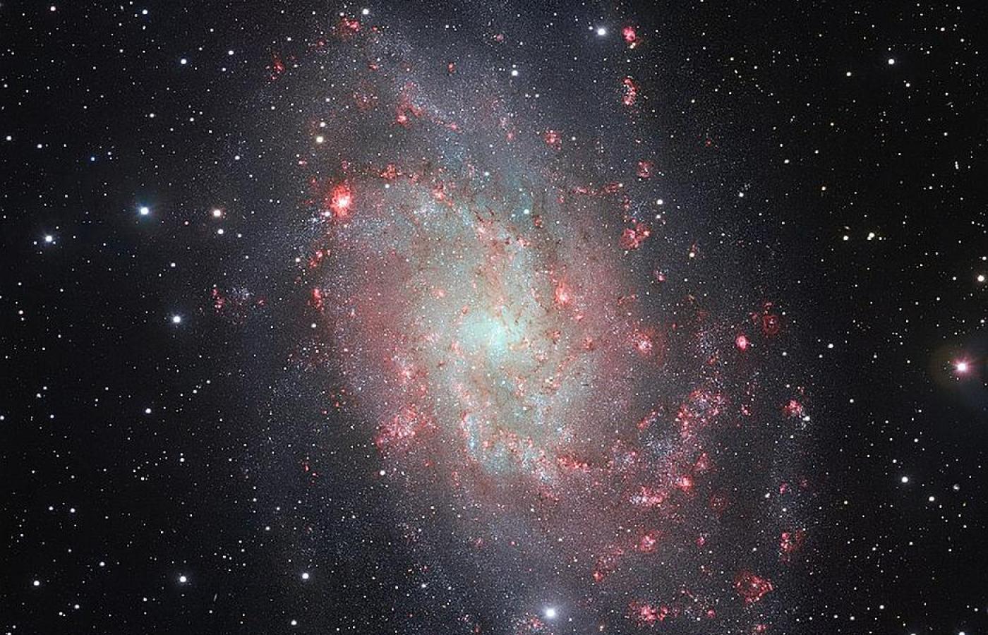 Nie ta cecha jednak decyduje o jej wyjątkowości. Ważne jest to, że znajduje się w niej najwięcej w naszym lokalnym kosmosie bardzo dynamicznych obszarów gwiazdotwórczych, zwanych H II, czyli mocno świecących obszarów gazu i pyłu, w których dominuje zjonizowany wodór atomowy. To właśnie w nich rodzą się młode gwiazdy. W Trójkącie powstaje ich zatem znacznie więcej niż w jej większych koleżankach. Obłok NGC 604 (na zdjęciu niebieski pas z lewej strony powyżej centrum) jest najbardziej gwiazdotwórczym w całej Grupie Lokalnej (to jednocześnie drugi pod względem jasności obszar zjonizowanego wodoru).