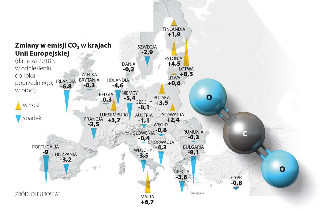 W skali całej Unii Europejskiej rozwój energetyki wiatrowej i słonecznej, a także ograniczanie roli węgla przynoszą efekty. W 2018 r. emisja dwutlenku węgla związana z używaniem paliw kopalnych (jak węgiel, ropa czy gaz) spadła o 2,5 proc. Pozytywne zmiany zawdzięczamy przede wszystkim Portugalii, Bułgarii, Irlandii, Niemcom i Holandii. Tam redukcja była najbardziej znacząca. Niestety, są też kraje, które zwiększyły emisję dwutlenku węgla. Należą do nich Malta, Estonia, Luksemburg i… Polska. W naszym przypadku wzrost wyniósł 3,5 proc. Jest to szczególnie niepokojące dla całej Unii, bo wszystkie inne duże kraje członkowskie albo redukują swoje emisje, albo przynajmniej trzymają je w ryzach.
