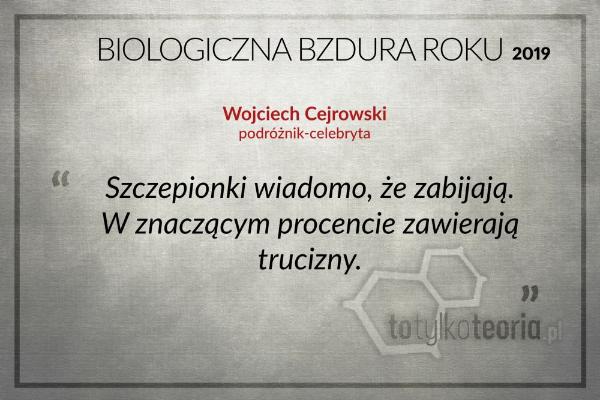 „Szczepionki wiadomo, że zabijają. W znaczącym procencie zawierają trucizny” – wygłosił w jednym ze swoich nagrań były mąż Beaty Pawlikowskiej, już wcześniej nominowany do Bzdury Roku. W tym samym nagraniu słyszymy, jak Cejrowski narzeka, że dzieci „niczego się w szkołach nie uczą”.