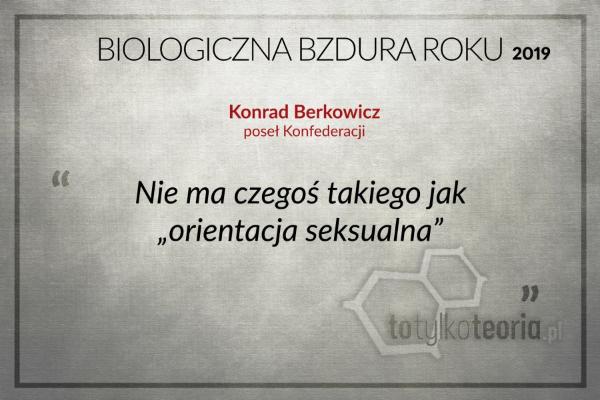 Konrad Berkowicz z Konfederacji nominację do Biologicznej Bzdury Roku otrzymał za stwierdzenie, że nie ma czegoś takiego jak orientacja seksualna, a pojęcie to wymyślono, by zaburzenie, jakim jest według konfederata homoseksualizm, traktować na równi z heteroseksualizmem. Cóż. W maju 1990 r. Światowa Organizacja Zdrowia wykreśliła homoseksualizm z listy dewiacji i zaburzeń seksualnych. Przez żadne środowisko naukowe nie jest on uznawany za chorobę, a – obok heteroseksualizmu i biseksualizmu – za jedną z orientacji seksualnych właśnie. Skąd dokładnie wywodzi się taka, a nie inna orientacja seksualna u konkretnego człowieka – jak dotąd nie udało się naukowcom rozstrzygnąć. Kwestia źródeł homoseksualności jest dużo bardziej skomplikowana i nie da się jej sprowadzić do oklepanego już sporu: geny czy środowisko. To wiadomo na pewno.