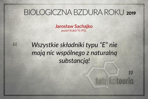 Poseł PSL-Kukiz ’15 Jarosław Sachajko nominację otrzymał za stwierdzenie, że „wszystkie składniki typu E nie mają nic wspólnego z naturą”. Zdanie nie tylko gramatycznie niepoprawne, powiela także popularne przekonanie, że dodatki do żywności oznaczane literą „E” są w każdym wypadku sztuczne i niezdrowe. A nie są. Sachajko najwyraźniej zapomina o witaminach czy korzystnych dla nas barwnikach, takich jak likopen czy antocyjany. „Pamiętać też należy, że to, czy [związki] są pochodzenia naturalnego, czy syntetycznego, nie definiuje ich działania na organizm. Istotna jest budowa chemiczna, forma, sposób i okoliczności (np. pora dnia) spożycia” – podkreśla Sakowski.