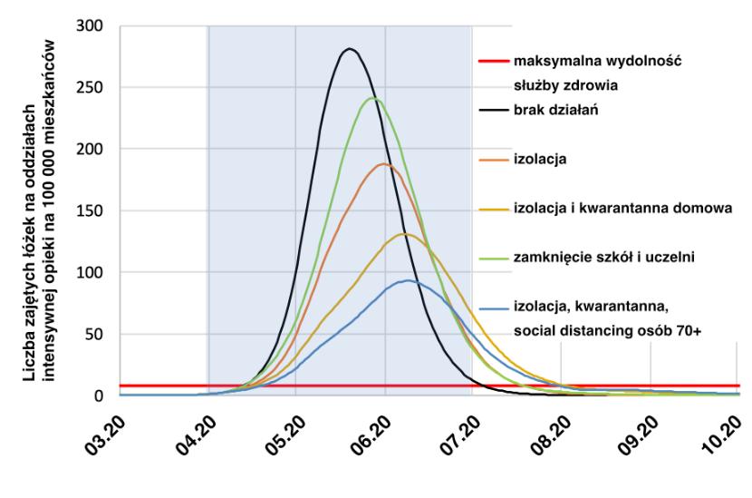 Na ilustracji powyżej (ilustracja 3) – krzywe odpowiadają różnym scenariuszom tłumienia epidemii w Wielkiej Brytanii. Czerwona linia wyznacza granicę wydolności oddziałów intensywnej terapii (liczbę łóżek). Czarna linia to przebieg epidemii nietłumionej. Zielona odpowiada sytuacji, w której zamknięte są szkoły i uczelnie, osoby chore są izolowane, a od 20 marca w całej populacji obowiązują zasady social distancing. Pomarańczowa oznacza izolowanie chorych, domową kwarantannę, powszechne dystansowanie społeczne – oraz nieczynne szkoły i uniwersytety. Błękitne pole wyznacza okres obowiązywania restrykcji (ilustracja na dole to przeskalowana część górnej ilustracji).