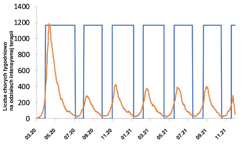 Linia pomarańczowa oznacza tygodniową liczbę przyjęć na oddziały intensywnej terapii. Kiedy tylko przekroczy ona określony próg, powiedzmy 100, państwo uruchamia pakiet radykalnych ograniczeń w kontaktach społecznych. Kiedy liczba poważnych przypadków spada poniżej dolnego progu, powiedzmy 50, ograniczenia są wyłączane (przy czym osoby z objawami choroby i ich rodziny pozostają w domach). Niebieska linia wyznacza okresy, w których obowiązują zasady social distancing każące ograniczyć intensywność kontaktów o 75 proc.