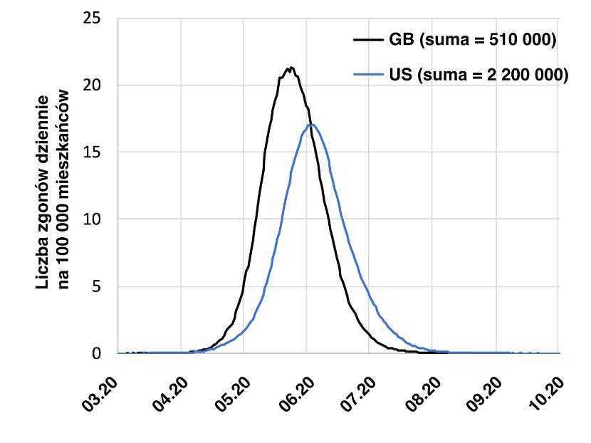 Efekty? Na wykresach poniżej. Jeśli nie doszłoby do jakichkolwiek działań, oznaczałoby to, że zakażeniu ulegnie 81 proc. populacji obu tych krajów (ilustracja 1). Oznaczałoby to też blisko 510 tys. zgonów w Wielkiej Brytanii i 2,2 mln w USA – nie licząc dodatkowych ofiar zablokowanego przez pandemię systemu opieki zdrowotnej. Zapotrzebowanie na łóżka na oddziałach intensywnej terapii przekroczyłoby dostępną ich liczbę już w połowie kwietnia, a szczyt zapotrzebowania byłby 30-krotnie wyższy niż ta właśnie liczba.