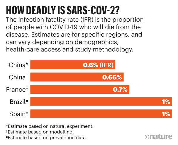Tygodnik „Nature” pisze na swojej stronie internetowej, że po miesiącach zbierania danych o pandemii naukowcy są coraz bliżej odpowiedzi na kluczowe pytanie, jak zabójczy jest wirus SARS-CoV-2. Innymi słowy, jaki procent zakażonych osób nie przeżyje wywoływanej przez niego choroby. Ustalenie tego nie jest łatwe, gdyż potrzeba danych, ilu ludzi przeszło infekcję, a u sporej grupy przebiega ona bezobjawowo lub bardzo łagodnie. Ponadto ryzyko śmierci z powodu Covid-19 może się znacznie różnić w zależności od wieku, pochodzenia etnicznego, dostępu do opieki zdrowotnej, statusu społeczno-ekonomicznego i ogólnej kondycji zdrowotnej danego człowieka.