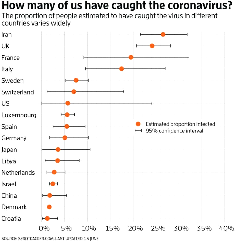 Tygodnik „New Scientist” podsumowuje wyniki analiz kilku zespołów naukowców, szacujących, ilu ludzi na świecie zostało zainfekowanych SARS-CoV-2. Jest w tej kwestii sporo niepewności, gdyż szacunki w poszczególnych krajach wahają się od 0,4 proc. populacji do 59 proc. Na razie pierwsza piątka państw z największą liczbą zakażonych osób wygląda następująco: Iran (27 proc.), Wielka Brytania (24 proc.), Francja (prawie 20 proc.), Włochy (prawie 18 proc.) i Szwecja (prawie 8 proc.). Przy czym duże różnice występują w poszczególnych krajach w zależności od regionu – np. w Hiszpanii testy serologiczne (na przeciwciała) wykonane u 60 tys. osób wykazały, że w całej populacji może być 5 proc. ludzi, którzy mieli lub mają w swoim organizmie koronawirusa, ale w Madrycie jest ich już dwa razy więcej. To kolejny sygnał, że jesteśmy jeszcze bardzo daleko do osiągnięcia odporności zbiorowej, która dla wielu znanych nauce wirusów atakujących ludzi wynosi ok. 70 proc.