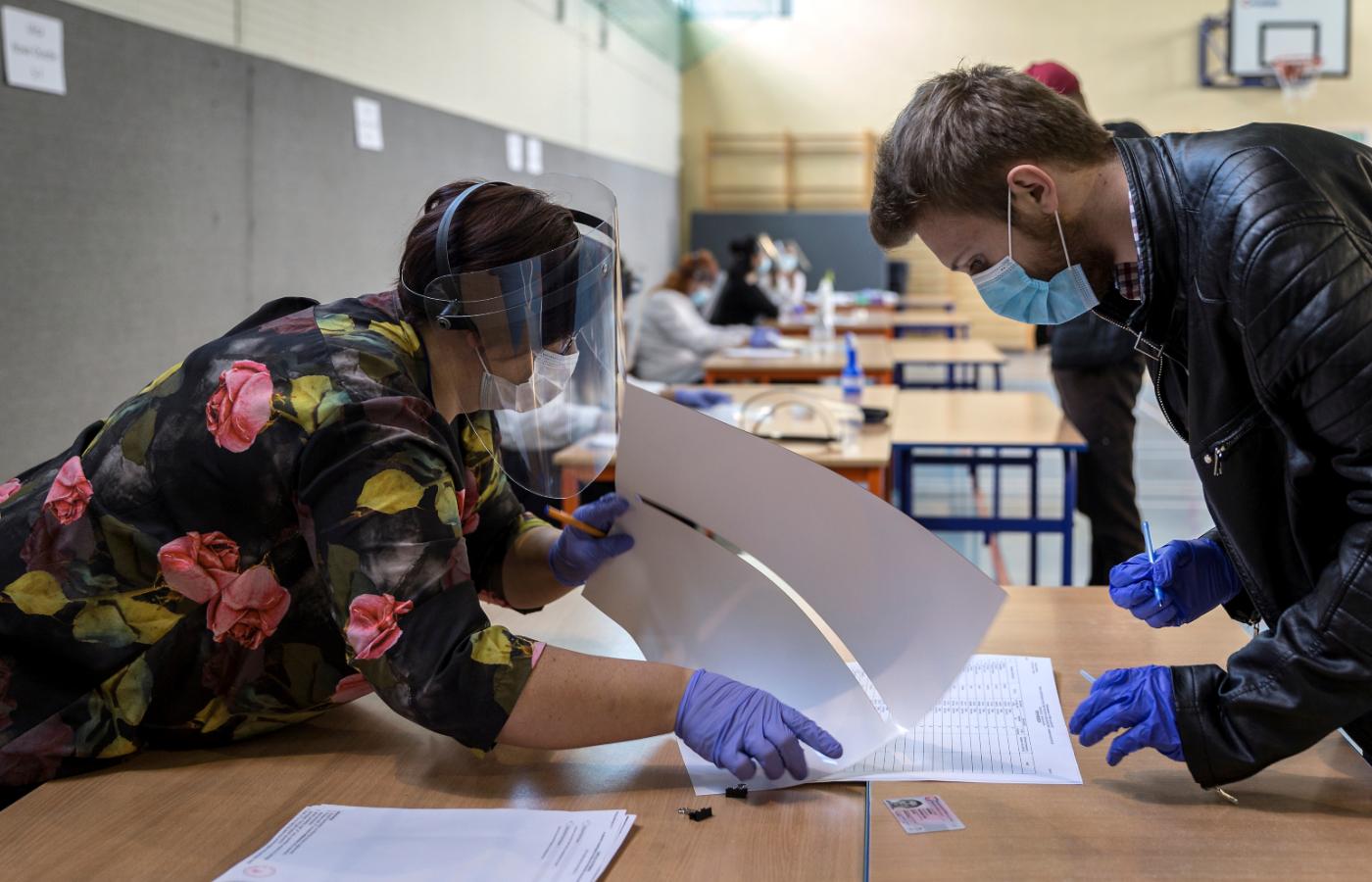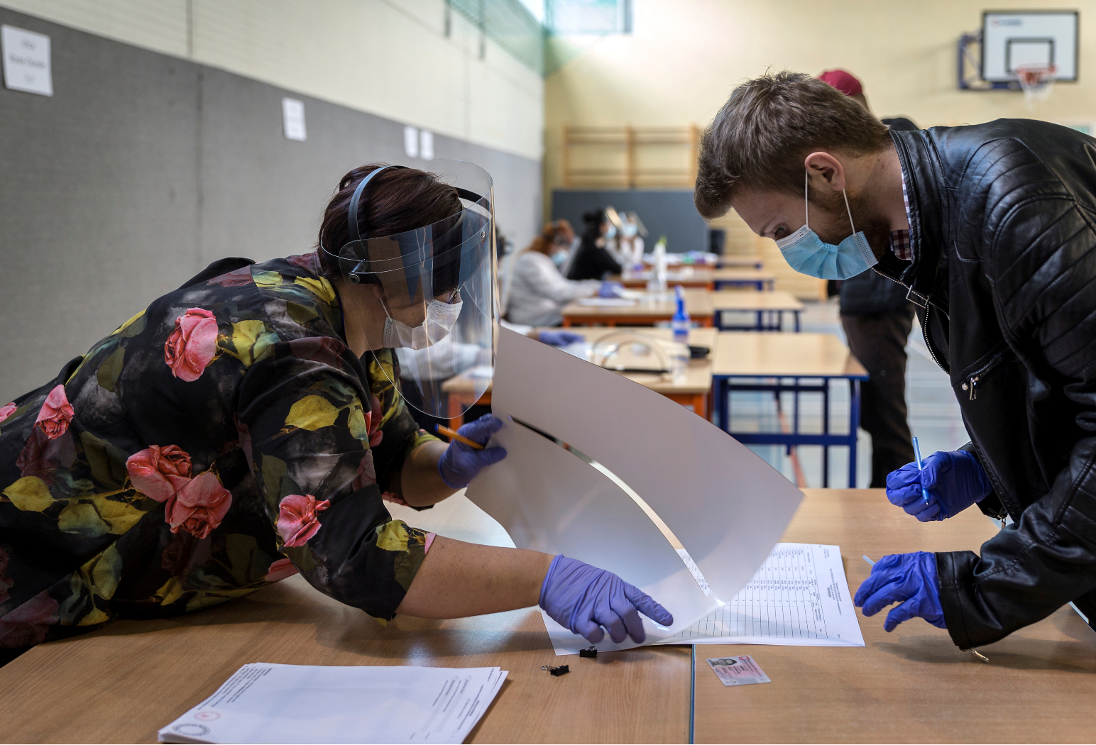 Stanowiska pracy poszczególnych członków komisji wyborczej mają być od siebie oddalone co najmniej półtora metra. Członkowie obwodowych komisji powinni pracować w jednorazowych rękawiczkach, maseczkach i przyłbicach.