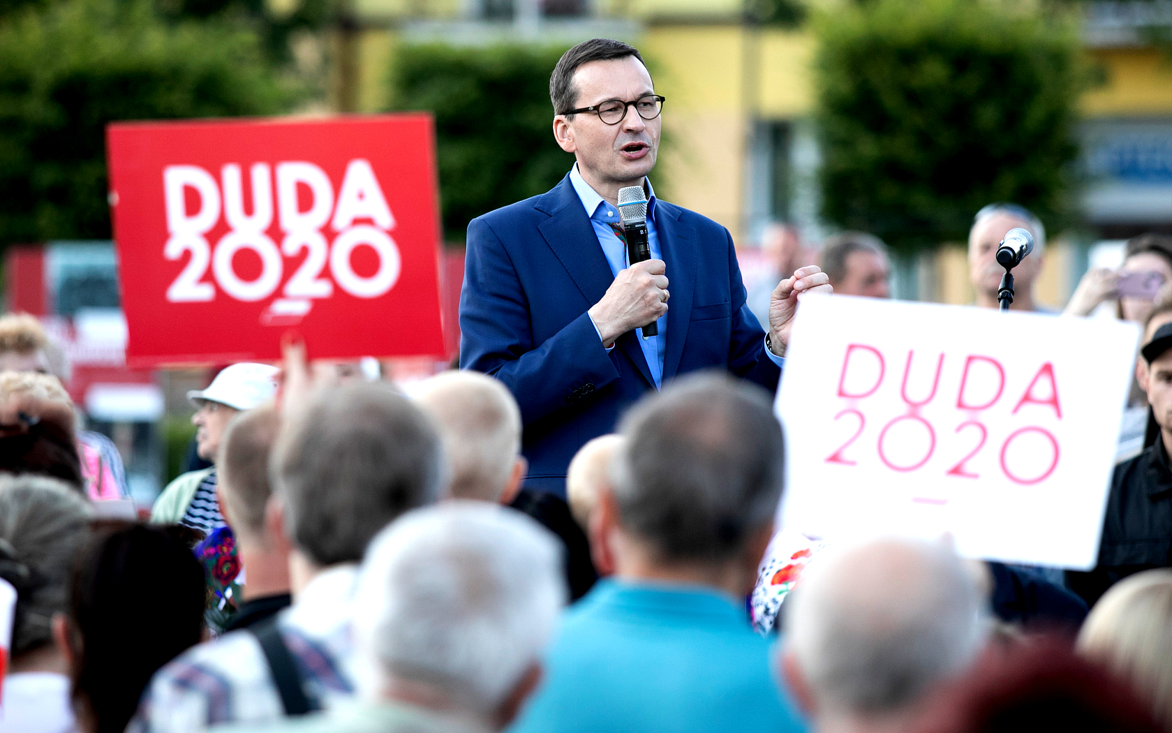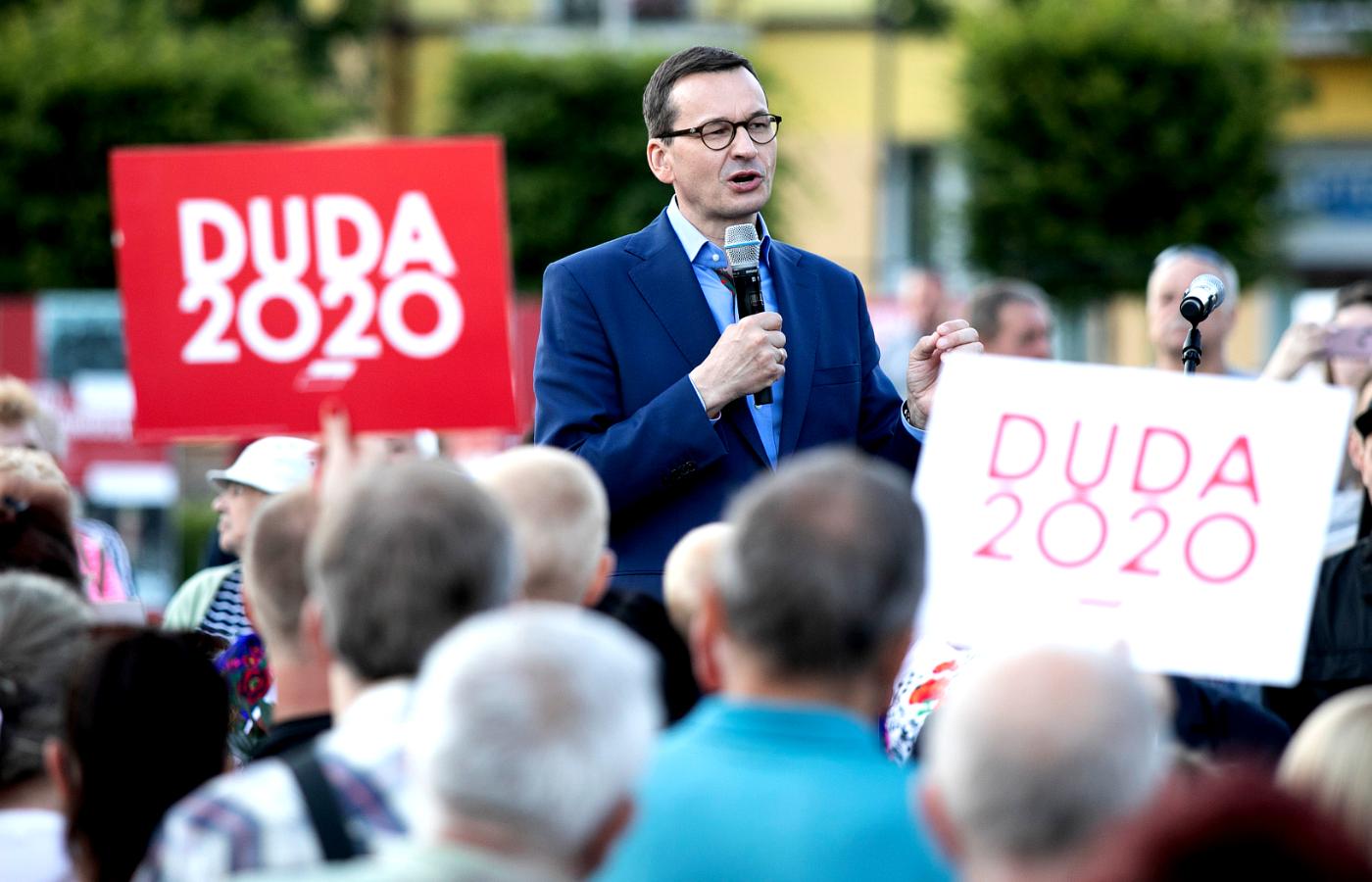 Premier do zgromadzonych: „Drodzy państwo, uważam, że sytuacja epidemiczna została opanowana, bo coraz mniej jest zachorowań. Śmiało idźcie do urn wyborczych 12 lipca. To jest bezpieczniejsze, niż jak codziennie wychodzicie do sklepu, na pocztę, do kościoła czy wszędzie indziej”.