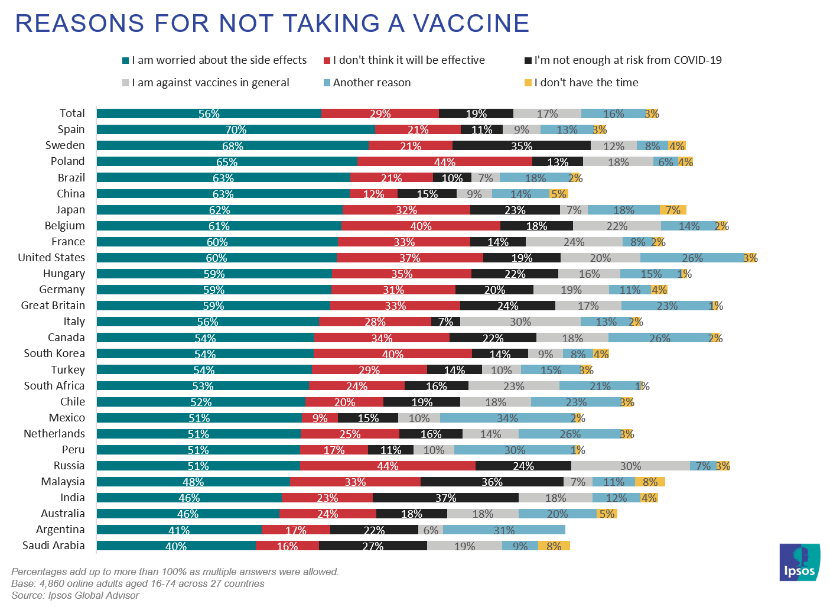 Bardzo ciekawe są uzasadnienia wskazywane przez Polaków, którzy zadeklarowali, że nie zamierzają się zaszczepić. 65 proc. obawia się skutków ubocznych takiego preparatu, 44 proc. nie wierzy, że będzie on skuteczny, 13 proc. uważa się za niezagrożonych koronawirusem, a 18 proc. sprzeciwia się jakimkolwiek szczepionkom (pozostali ankietowani wybrali odpowiedź: „inny powód” lub „brak czasu”). Najwięcej przeciwników wszelkich szczepionek jest w Rosji i Włoszech (po 30 proc.) oraz Francji (24 proc.), a najmniej w Argentynie (6 proc.), Brazylii, Japonii i Malezji (7 proc.).