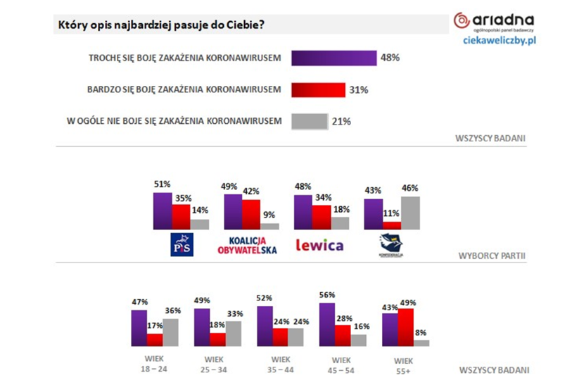 Jeśli zaś chodzi o poglądy polityczne, to im bardziej na prawo, tym robi się koronascpetyczniej. Najwięcej osób uważających, że epidemia koronawirusa stanowi bardzo poważne zagrożenie, znajduje się wśród wyborców Koalicji Obywatelskiej (60 proc.), następnie Lewicy (57 proc.) oraz Prawa i Sprawiedliwości (54 proc.). Na przeciwnym biegunie są wyborcy Konfederacji, wśród których zaledwie 17 proc. uważa, że pandemia covid-19 to bardzo poważne zagrożenie, a łącznie prawie połowa wyborców tej partii twierdzi, że epidemia nie jest niebezpieczna (24 proc.) lub nie ma jej wcale (21 proc.).