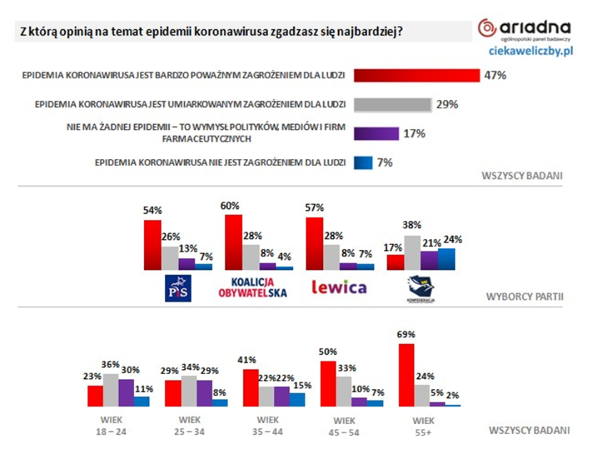 Nie zaskakuje natomiast, że poglądy na temat pandemii zmieniają się wraz z wiekiem, gdyż koronawirus stanowi największe zagrożenie dla osób starszych. Wśród grupy wiekowej 55+ zdecydowanie przeważa pogląd, iż epidemia to bardzo poważne zagrożenie (69 proc.). Z kolei wśród badanych z grupy wiekowej 18–24 lata tylko 23 proc. zgadza się z tym stwierdzeniem, natomiast prawie co trzeci (30 proc.) sądzi, że epidemia nie istnieje i jest wymysłem polityków, mediów oraz firm farmaceutycznych. Tę spiskową wizję podziela również prawie co trzecia osoba w wieku 25–34 lata (29 proc.).