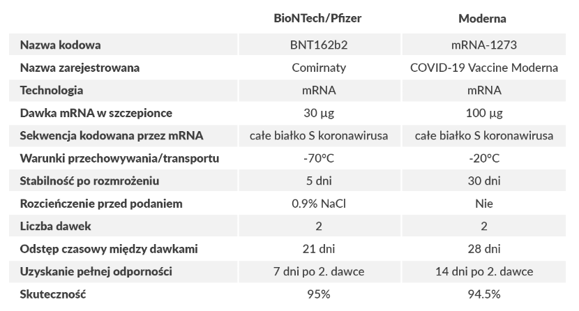 Jedna i druga szczepionka opiera się na cząsteczce informacyjnego RNA (mRNA), zawierającej sekwencje kodujące całe białko S koronawirusa, czyli jego charakterystyczny „kolec”. W obu przypadkach cząsteczka umieszczona jest w nanocząstkach lipidowych. W szczepionce BioNTechu/Pfizera mRNA jest 30 mcg, w produkcie Moderny – 100 mcg. Rezultat podania ich obu jest jednak taki sam – mRNA trafia do komórek, głównie mięśniowych, ulega translacji na rybosomach, a powstałe w tym procesie białko S jest dalej obrabiane w komórce i prezentowane na jej powierzchni jako obcy antygen. Rozpoznany przez komórki układu odpornościowego, wywołuje odpowiedź immunologiczną. Preparaty BioNTechu/Pfizera i Moderny sporo łączy, ale i różni.