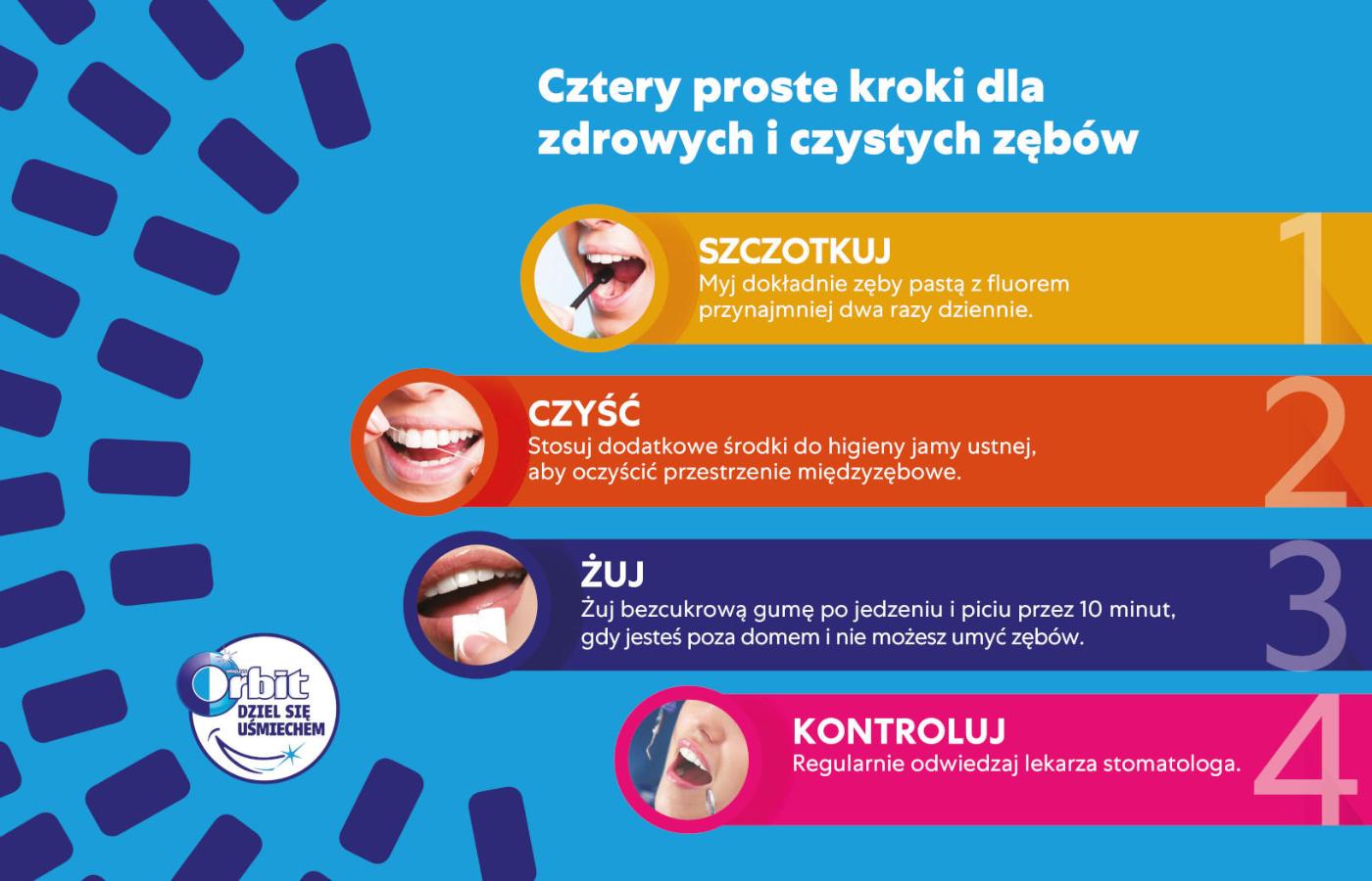 Wprowadzanie dobrych nawyków od najmłodszych lat nie musi być trudne. Wystarczy stosować 4 proste kroki do zdrowych i czystych zębów. Łatwo je zapamiętać i wdrożyć do codziennej rutyny dzieci oraz dorosłych. Obok mycia zębów dwa razy dziennie, używaniu nici dentystycznych czy płynu do płukania oraz regularnych przeglądów dentystycznych dwa razy do roku, z pomocą przychodzi również żucie bezcukrowej gumy. Stymuluje ona wydzielanie śliny, która stanowi ważną naturalną ochronę jamy ustnej przed próchnicą zębów.