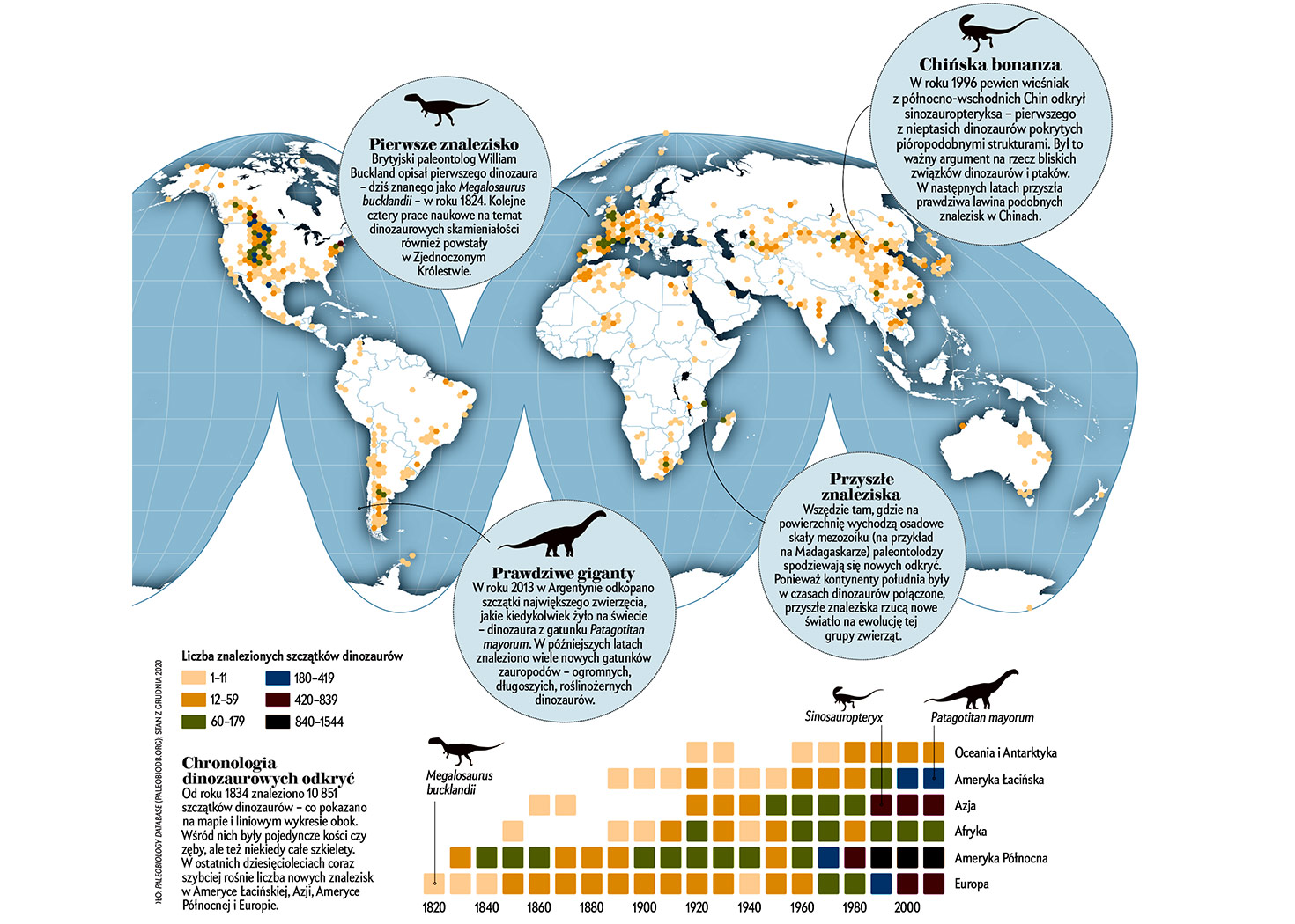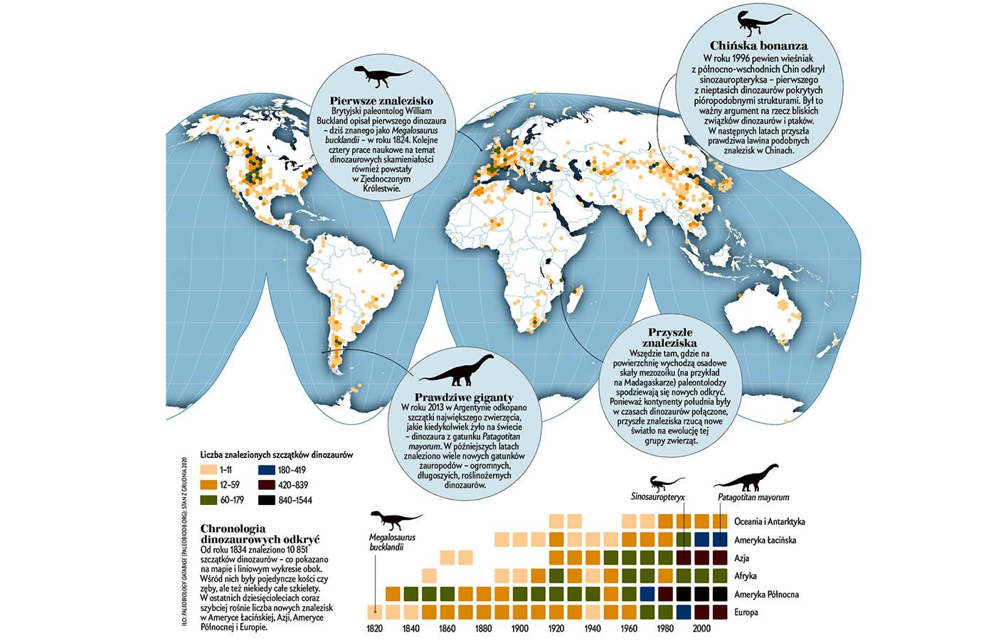 Od czasu, kiedy 200 lat temu opisano w Anglii po raz pierwszy kości dinozaura, na świecie znaleziono około 11 tys. dinozaurowych szczątków, z czego dwie trzecie w Ameryce Północnej i Europie. Większość tych znalezisk pochodzi z ojczystych krajów paleontologów, którzy dokonali odkryć, stąd nadreprezentacja rejonów o dobrze rozwiniętej paleontologii. Samantha Hopkins z University of Oregon zwraca nawet uwagę, że więcej znalezisk na terenie jej stanu pochodzi z obszarów wzdłuż utwardzonych i dobrze utrzymanych dróg niż z poboczy gorzej dostępnych szlaków. Ostatnie dziesięciolecia przyniosły jednak geograficzną ekspansję stanowisk ze skamieniałościami, w szczególności we wschodniej Azji i południowej części Ameryki Południowej. To rozszerzenie zasięgu stanowisk dinozauronośnych wymaga wykształcenia lokalnych paleontologów, a to nie zawsze jest proste, zważywszy na niszowy (i zwykle kiepsko płatny) charakter tej profesji. Takie inwestycje przynoszą jednak owoce: do dziś paleontolodzy opisali około 1000 gatunków dinozaurów i przypuszczają, że pozostało jeszcze do odkrycia co najmniej drugie tyle.