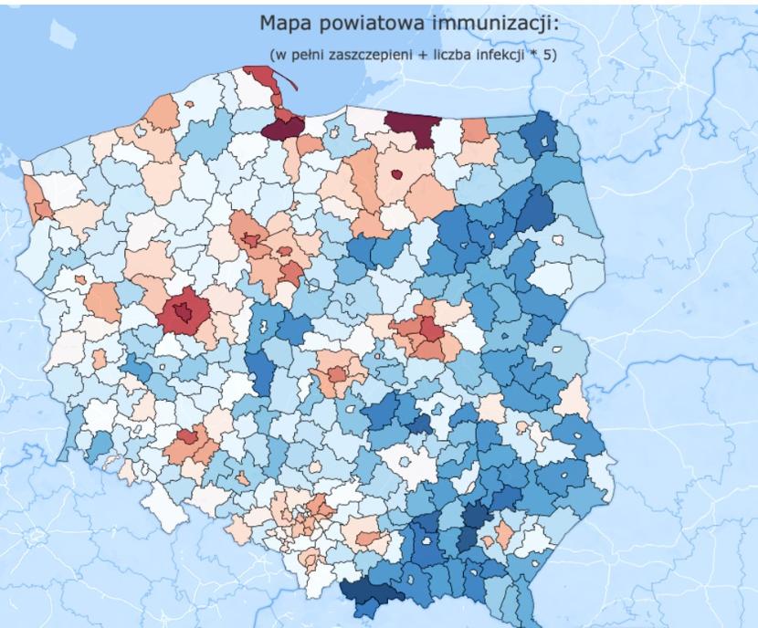 Spośród wielu map obrazujących wskaźnik wyszczepialności i publikowanych w sieci oraz mediach społecznościowych najbardziej lubię śledzić dane prezentowane przez Wiesława Seweryna, który przedstawia je w szczegółowym rozbiciu na gminy i powiaty. Poza tym dane z jego mapy liczone są na podstawie populacji, liczby w pełni zaszczepionych oraz zarejestrowanych infekcji (z uwzględnieniem niedoszacowania wynikającego z pomijania testów u przeciętnie co piątej osoby zakażonej).