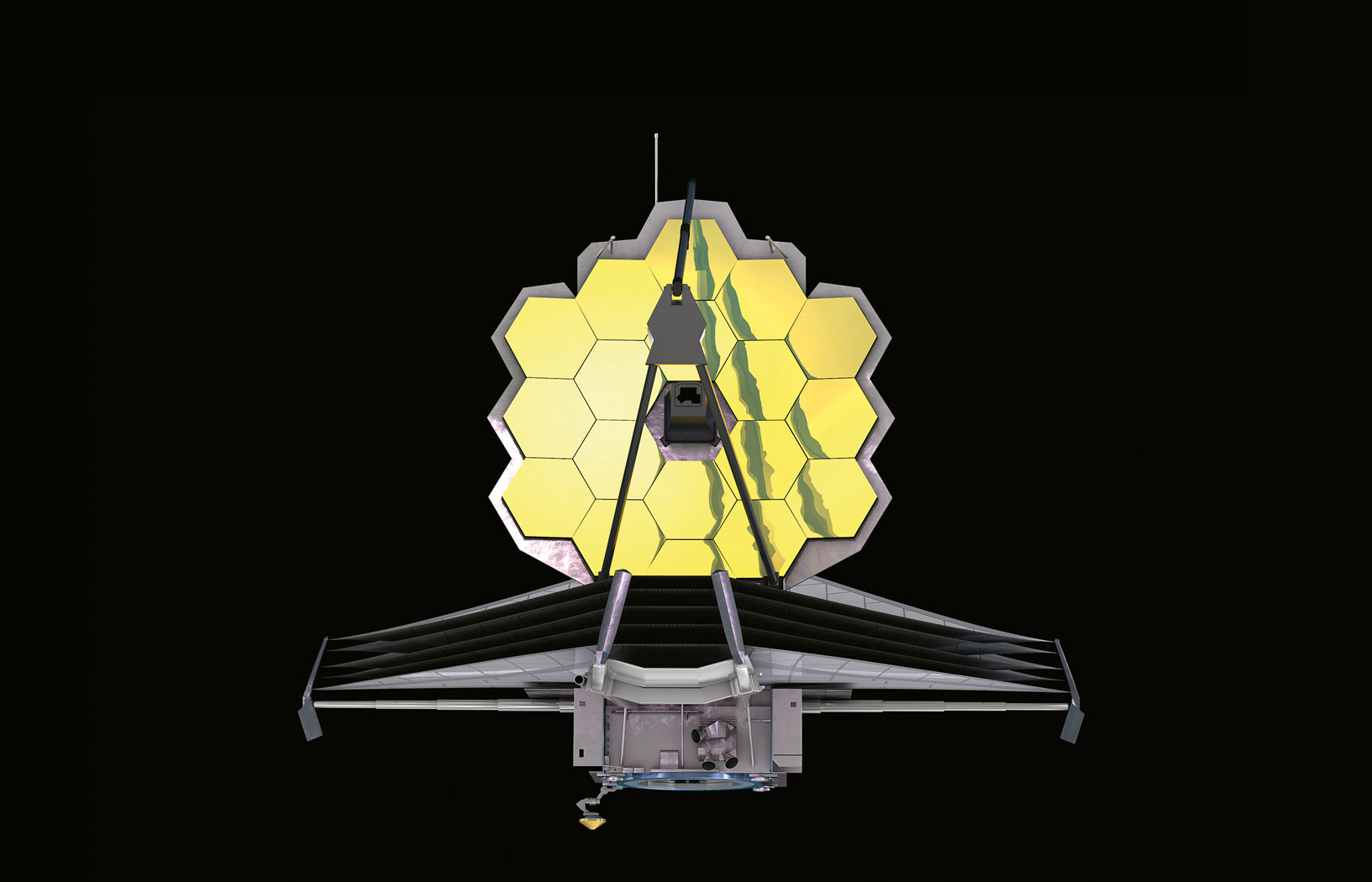 JWST ma wysokość 8 m, waży 6,2 tony i składa się z 18 sześciokątnych elementów – zwierciadeł – o średnicy 1,32 m każde. Szkielet, na którym się opierają, został wykonany z berylu, same zwierciadła zaś pokryto cienką warstwą złota, metalu bardzo czułego na promieniowanie podczerwone.